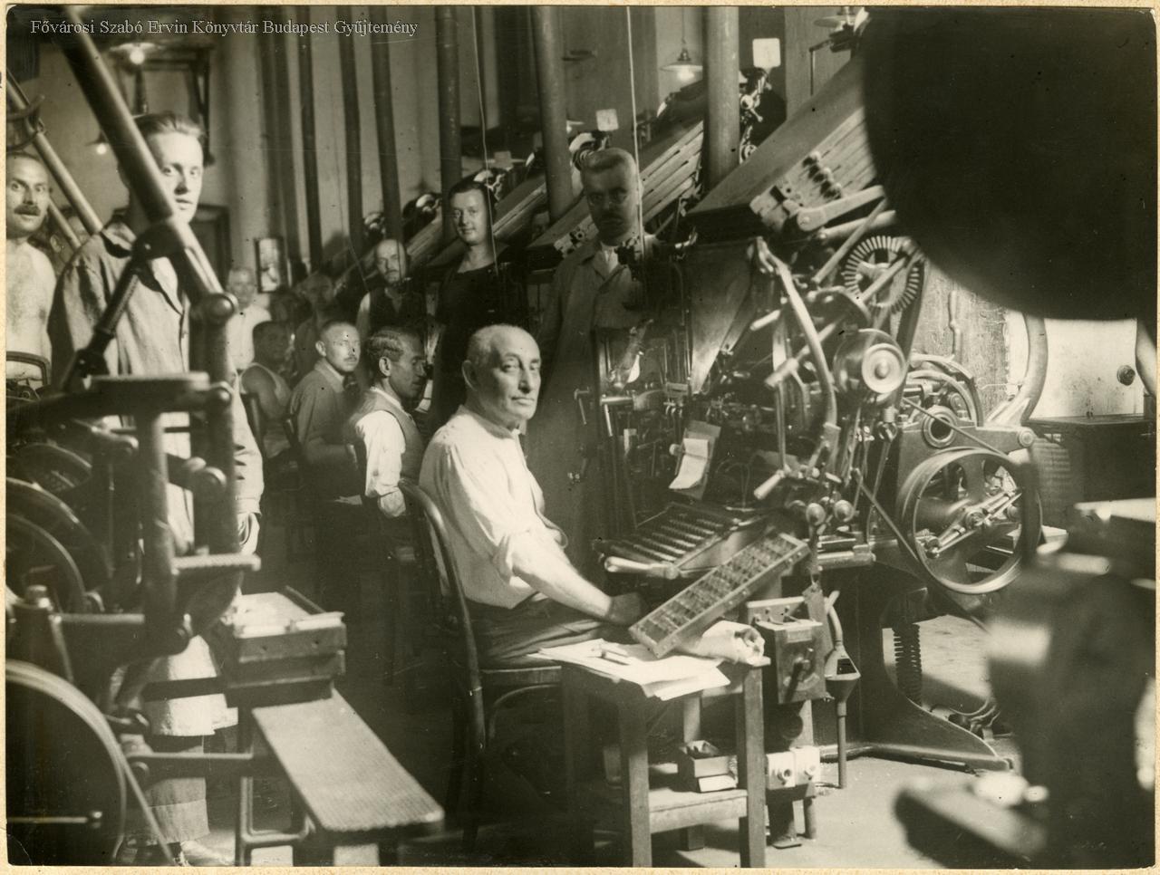 [A Budapesti Hírlapnyomda szedőterme, nyomdászok]