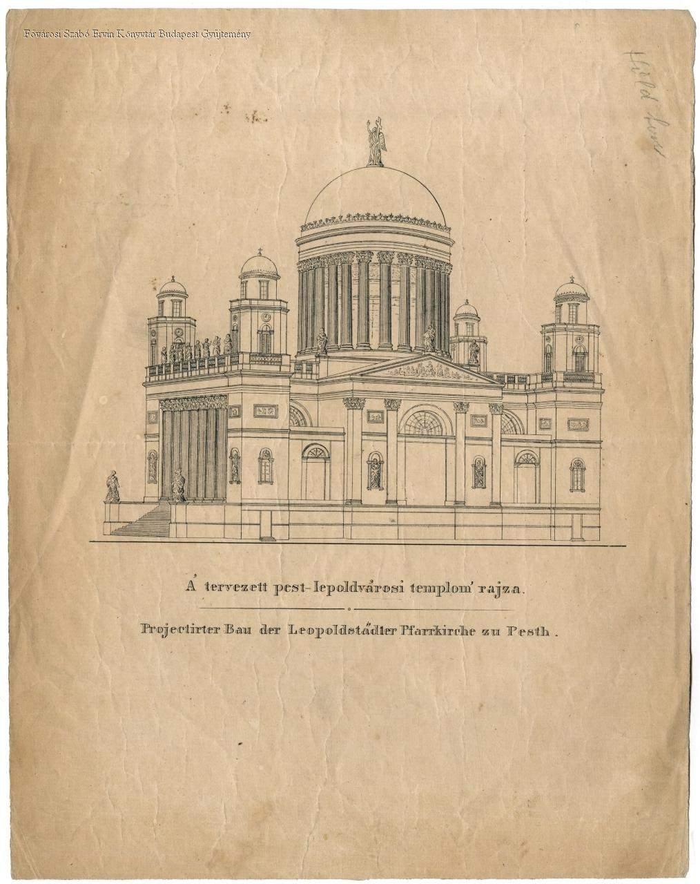 A rajz alatt felirat: " A' tervezett pest-leopoldvárosi templom' rajza. Projectirter Bau der Leopoldstädter Pfarrkirche zu Pesth."