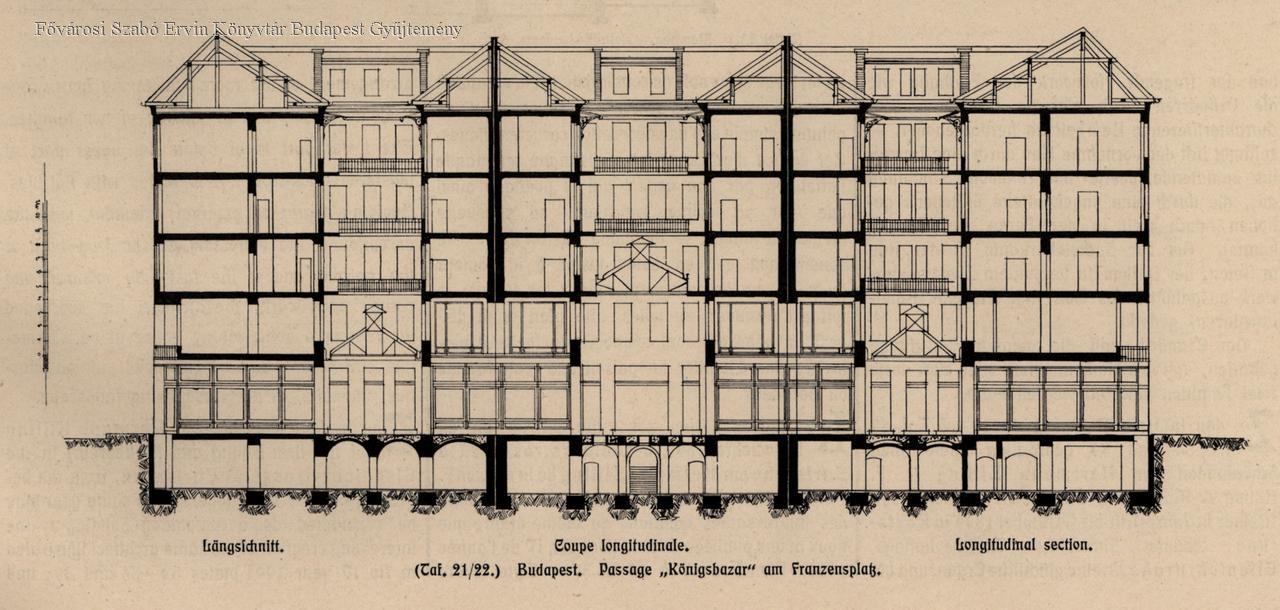Budapest, passage "Königsbazar" am Franzensplatz Längsschnitt = Coupe longitudinale = Longitudinal section /