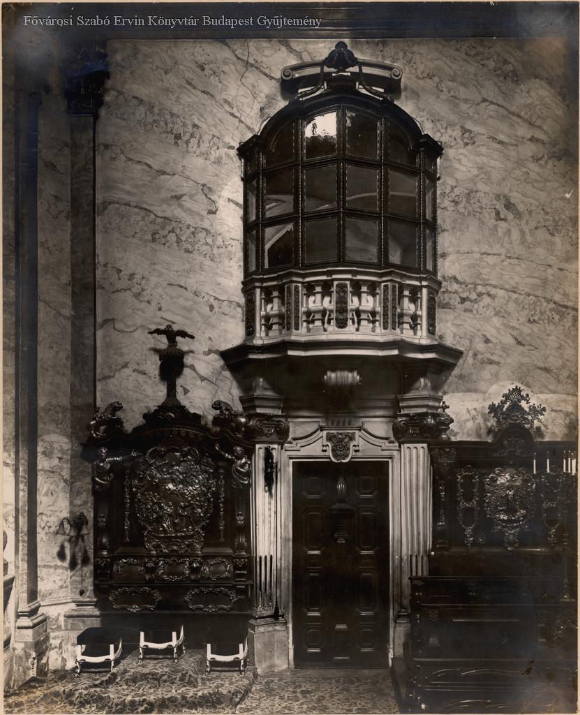 templom, katolikus egyház, díszítés, fafaragás, ülőbútor, szentély, ajtó, erkély, címer, barokk, épületkép, belső felvétel, 1900-as évek