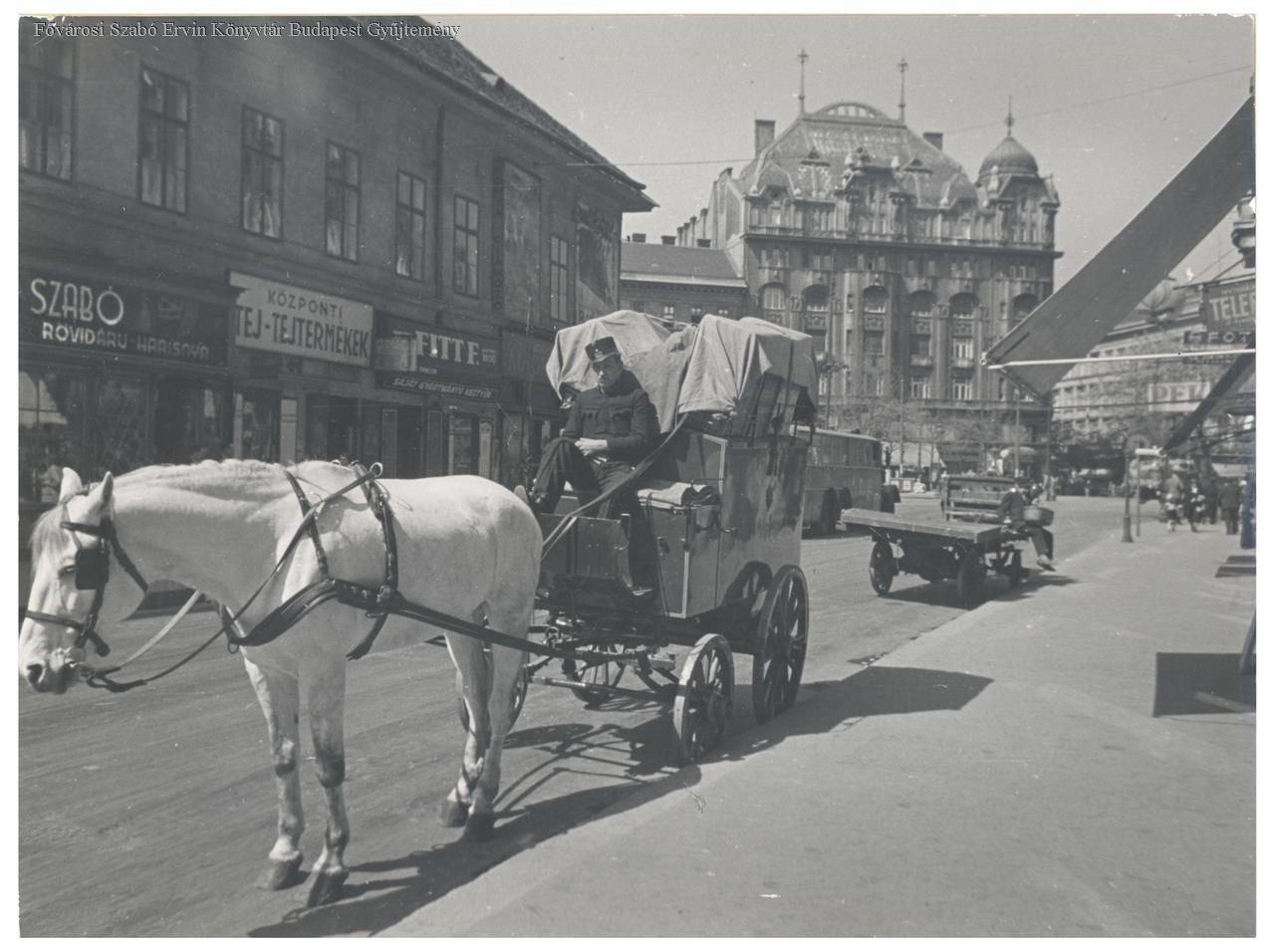 [Postai csomagokat szállító lovas kocsi a Ráday utcában] [kilátás a Kálvin tér és a Kecskeméti utca sarka irányába]