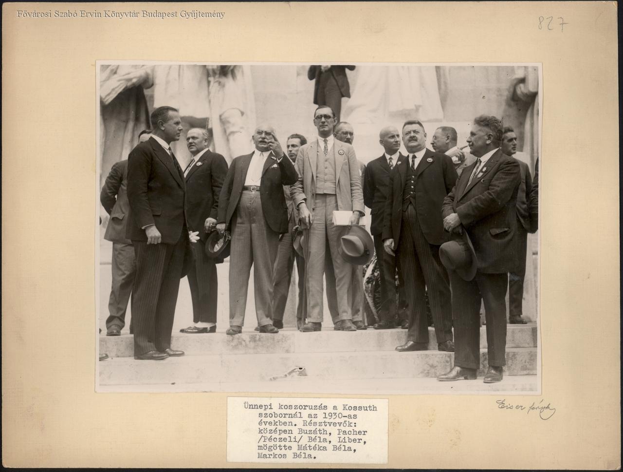 Középen felemelt kézzel: Zilahy Dezső, tőle jobbra Pécely (Pacher) Béla, majd Liber Endre; Pécely mögött, kissé takarva Mátéka Béla, tőle balra Markos Béla