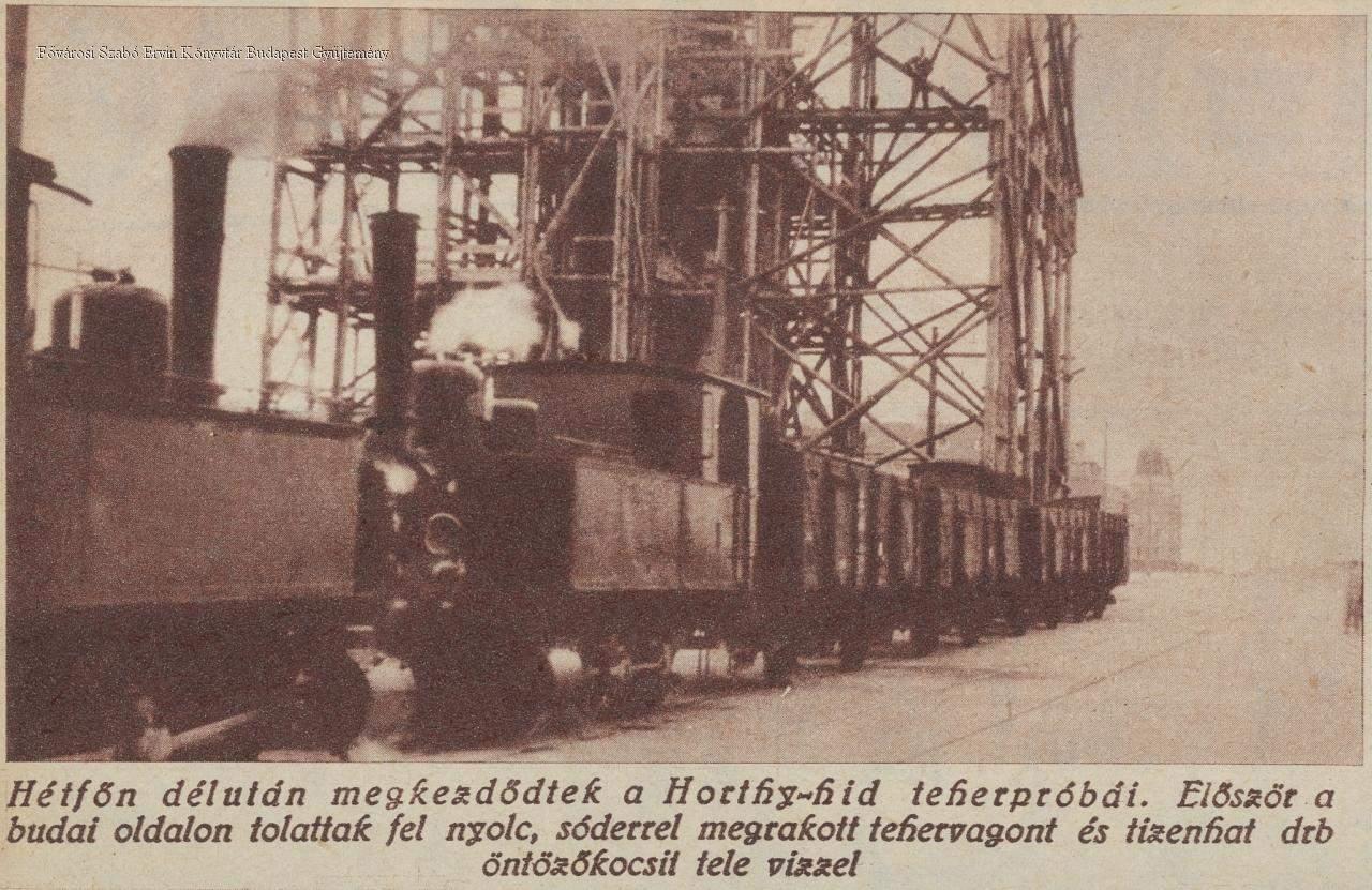 Hétfőn délután megkezdődtek a Horthy-híd teherpróbái először a budai oldalon tolattak fel nyolc, sóderrel megrakott tehervagont és 16 drb öntözőkocsit tele vízzel
