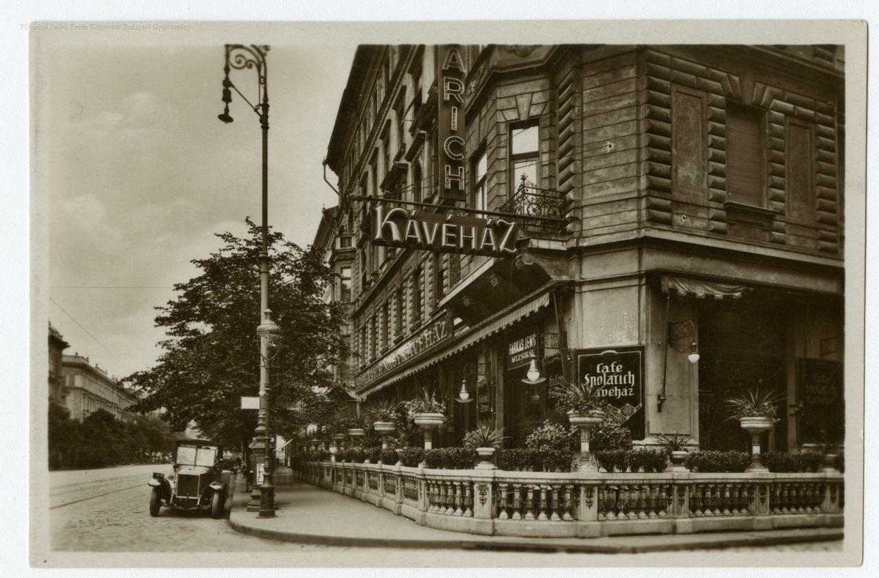 épületkép, kávéház, külső felvétel, utcakép, gépjármű, képes levelezőlap, 1930-as évek