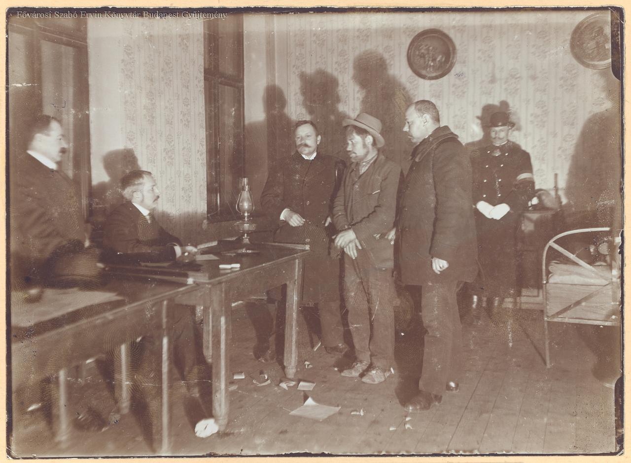rendőrség, kihallgatás, nyomozás, gyanúsított, bűnözés elleni küzdelem, asztal, sajtófotó, 1905