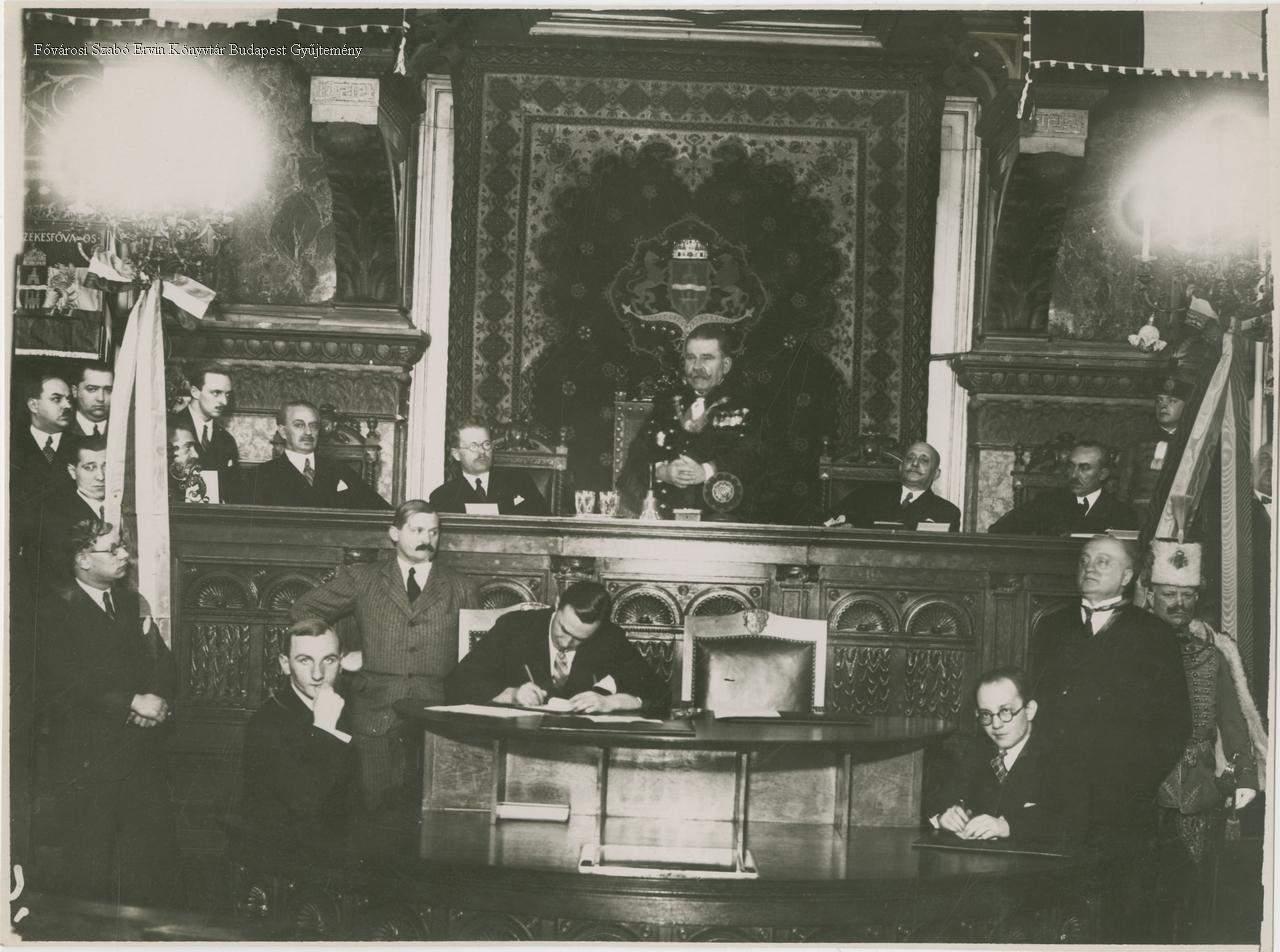 főpolgármester, polgármester, alpolgármester, önkormányzati képviselő, helyi politika, politikus, férfi, beiktatás, eskütétel, ünnepség, ünneplőruha, díszmagyar, címer, zászló, sajtófotó, eseménykép, Horthy-korszak, 1931