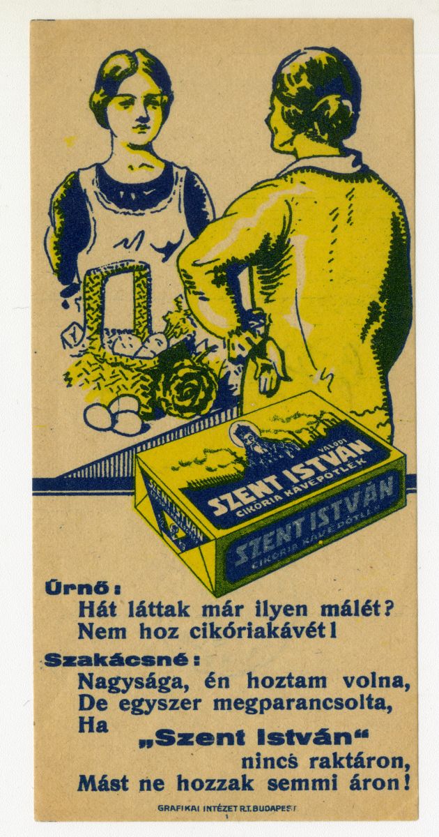 kávé, pótkávé, cikória, maláta, élvezeti cikk, ital, pörkölés, gyógyhatás, nő, szakácsnő, háztartási alkalmazott, reklámnyomtatvány, kisnyomtatvány, aprónyomtatvány, számolócédula