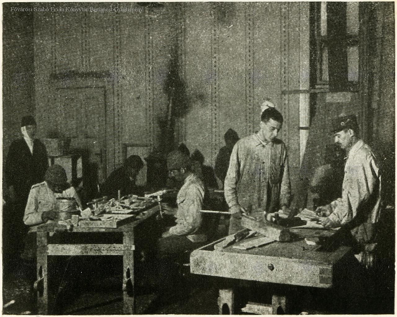első világháború, hadirokkant, háborús sebesült, szanatórium, orvosi rendelő, sebészet, munkavégzés, asztalos, belső felvétel, 1917