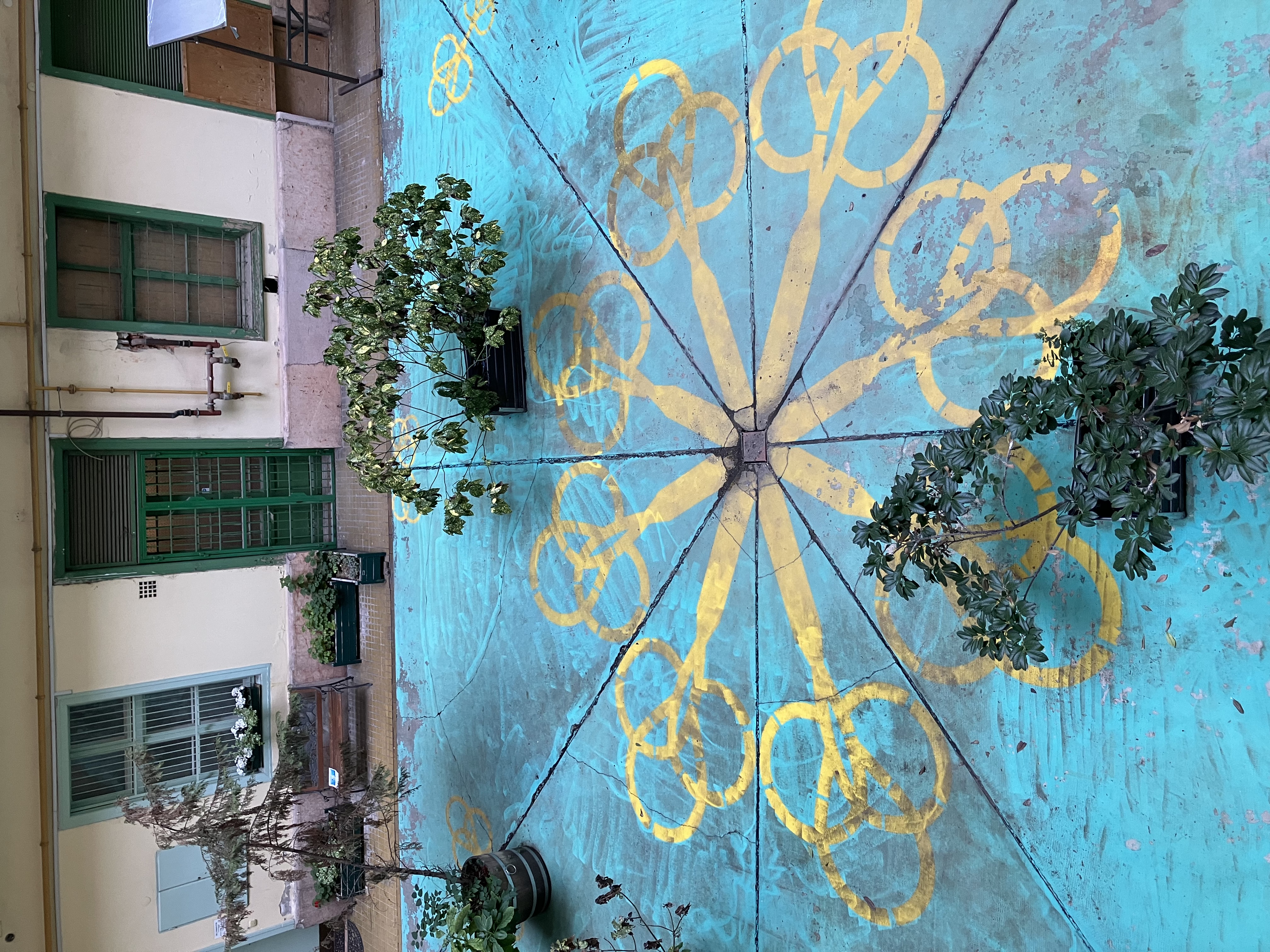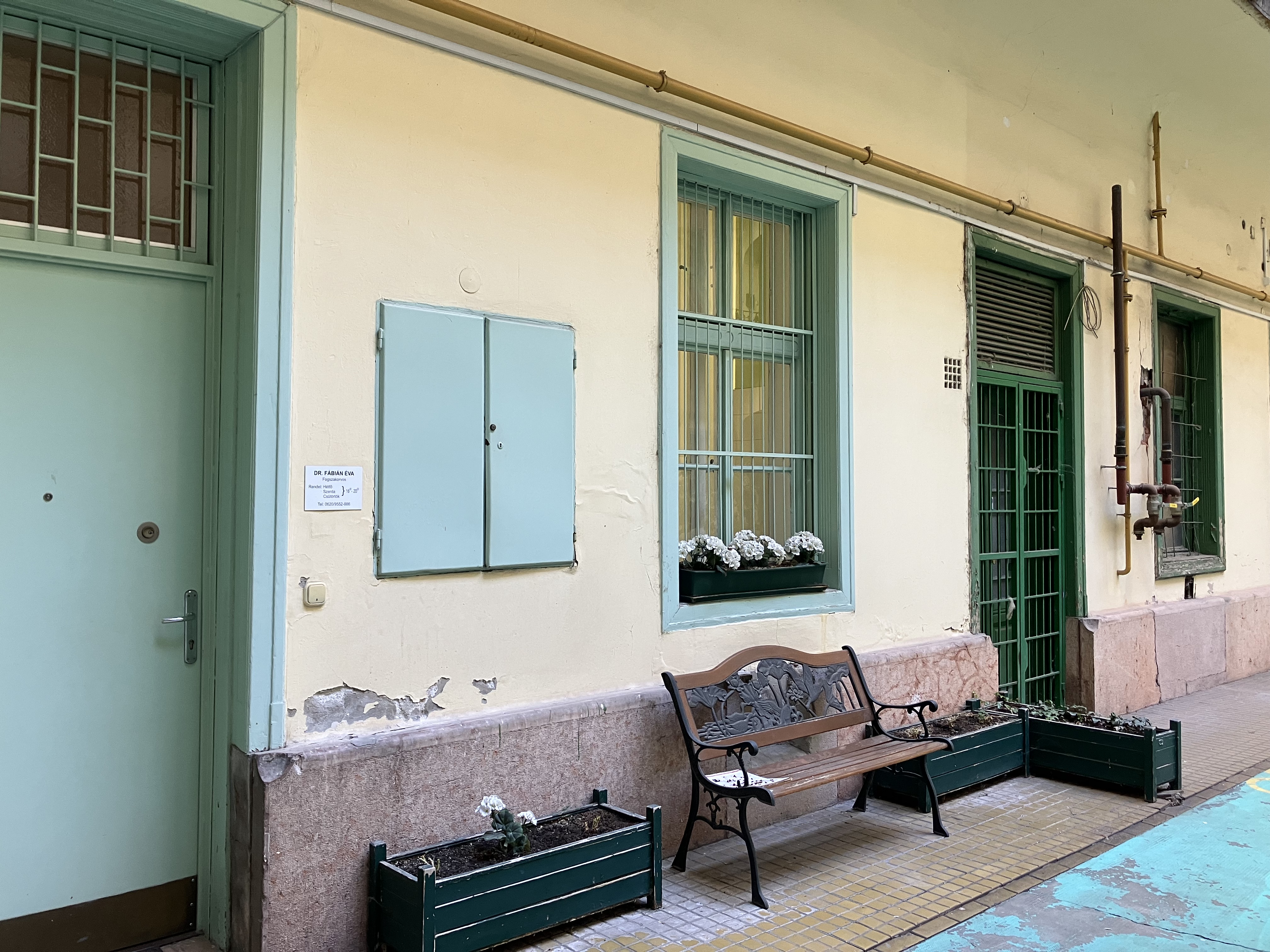 Az udvarra érve tovább fokozódik a vegyes benyomások tömege. Az udvaron jónéhány ipari méretű klíma külső egység surrog. Néhány reménytelenül ágaskodó növény és a zöldre festett, porolóprakkerekkel díszített udvari aljzat, jóindulatú hozzá nem értésről, vagy pénzhiányról árulkodik. Egy fogorvosi rendelőt hirdető tábla, a rendelő bejárata mellett köztéri pad.