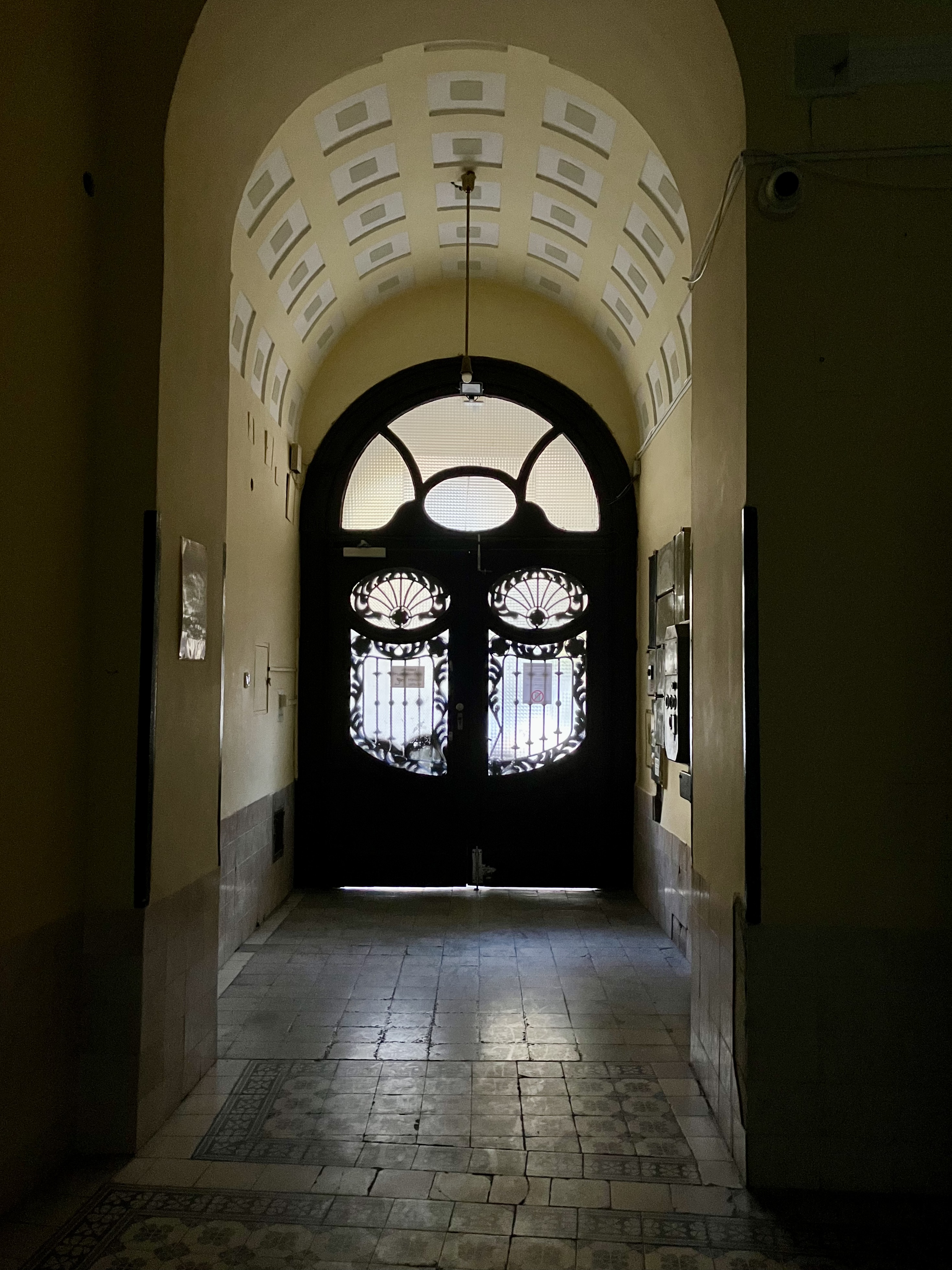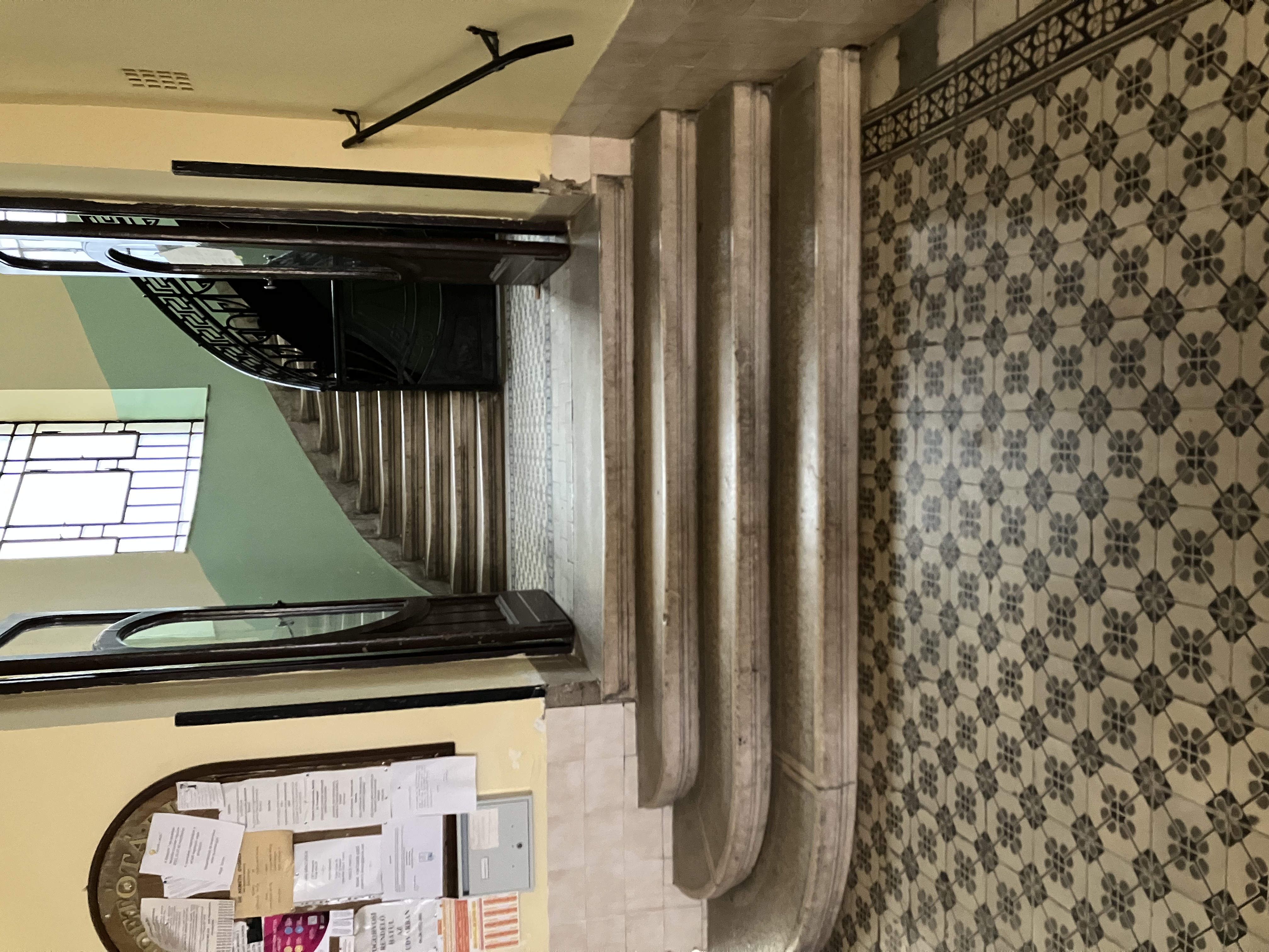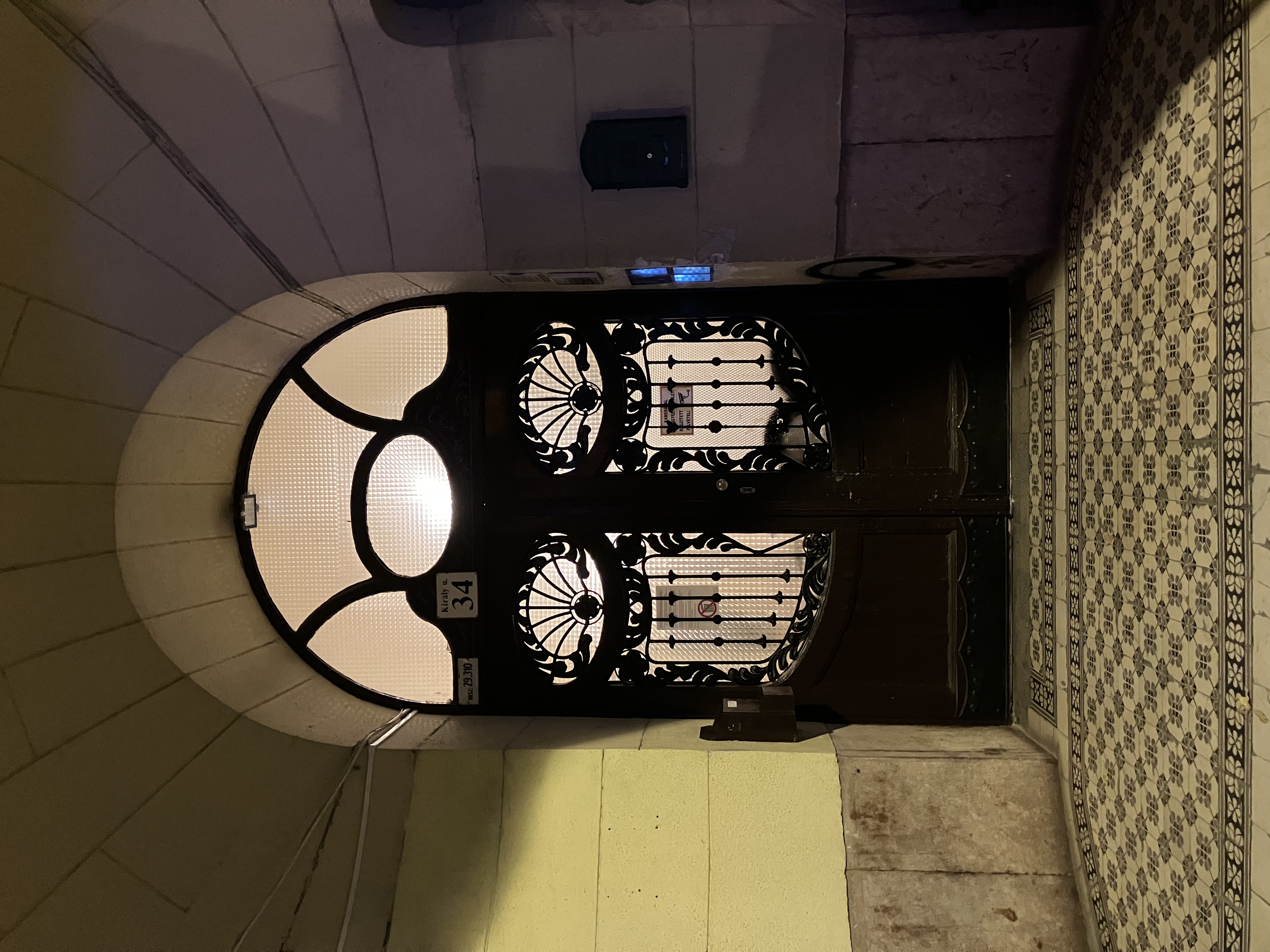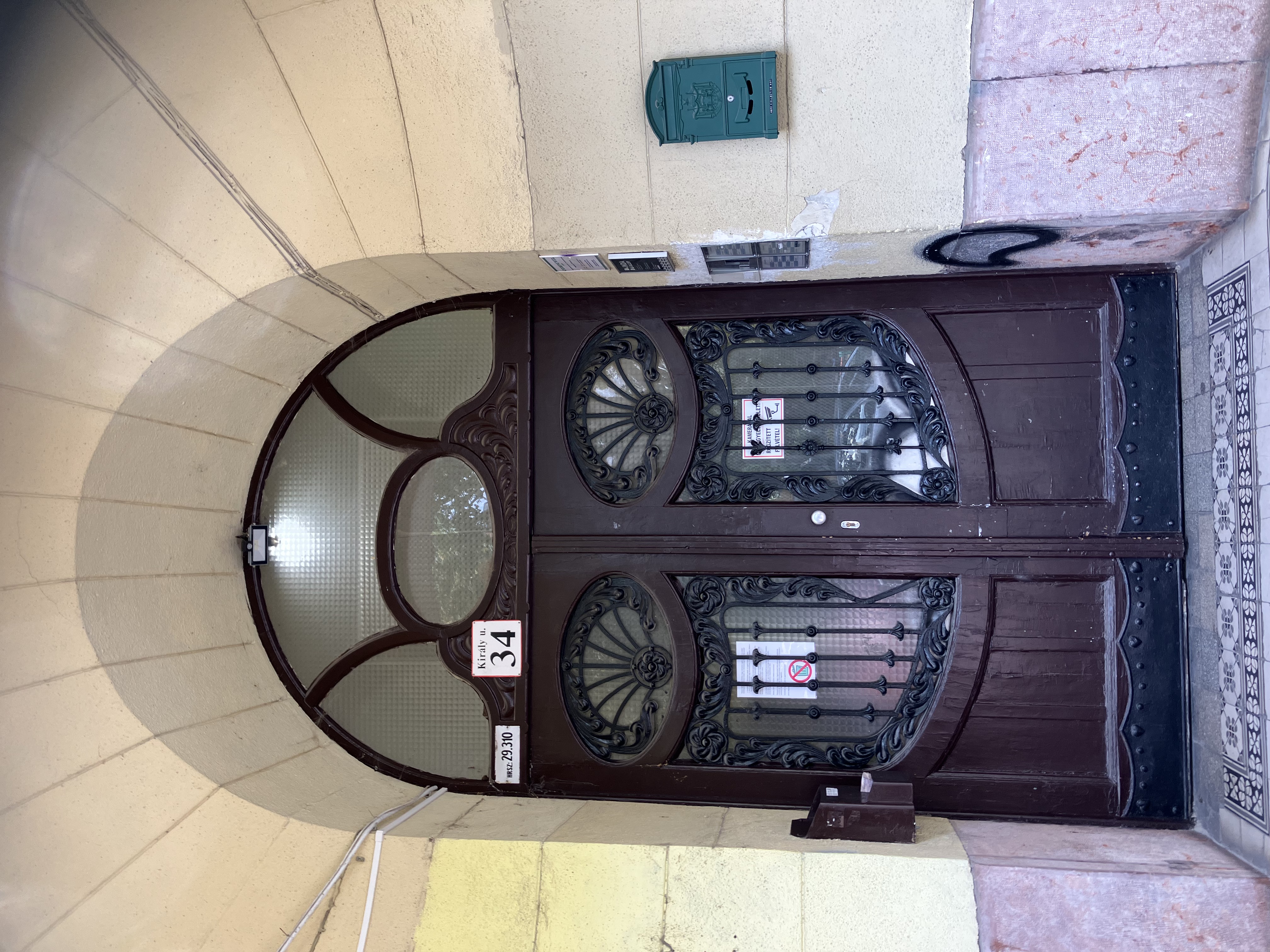 kapu gyönyörű, amit az üvegbetét a maga díszítő vasrácsával, kifejezetten szép és teljesen rendben van, a fellépő lépcső, a kapu nyitása kintről vagy bentről, szinte lehetetlenné teszi mozgássérült emberek, vagy kerekes székek közlekedését, és ez vonatkozik a lépcsőházhoz vezető néhány lépcsőre is. A lépcsőházban már lift működik de odáig eljutni a nem egészséges mozgású embereknek pokoljárás lehet.