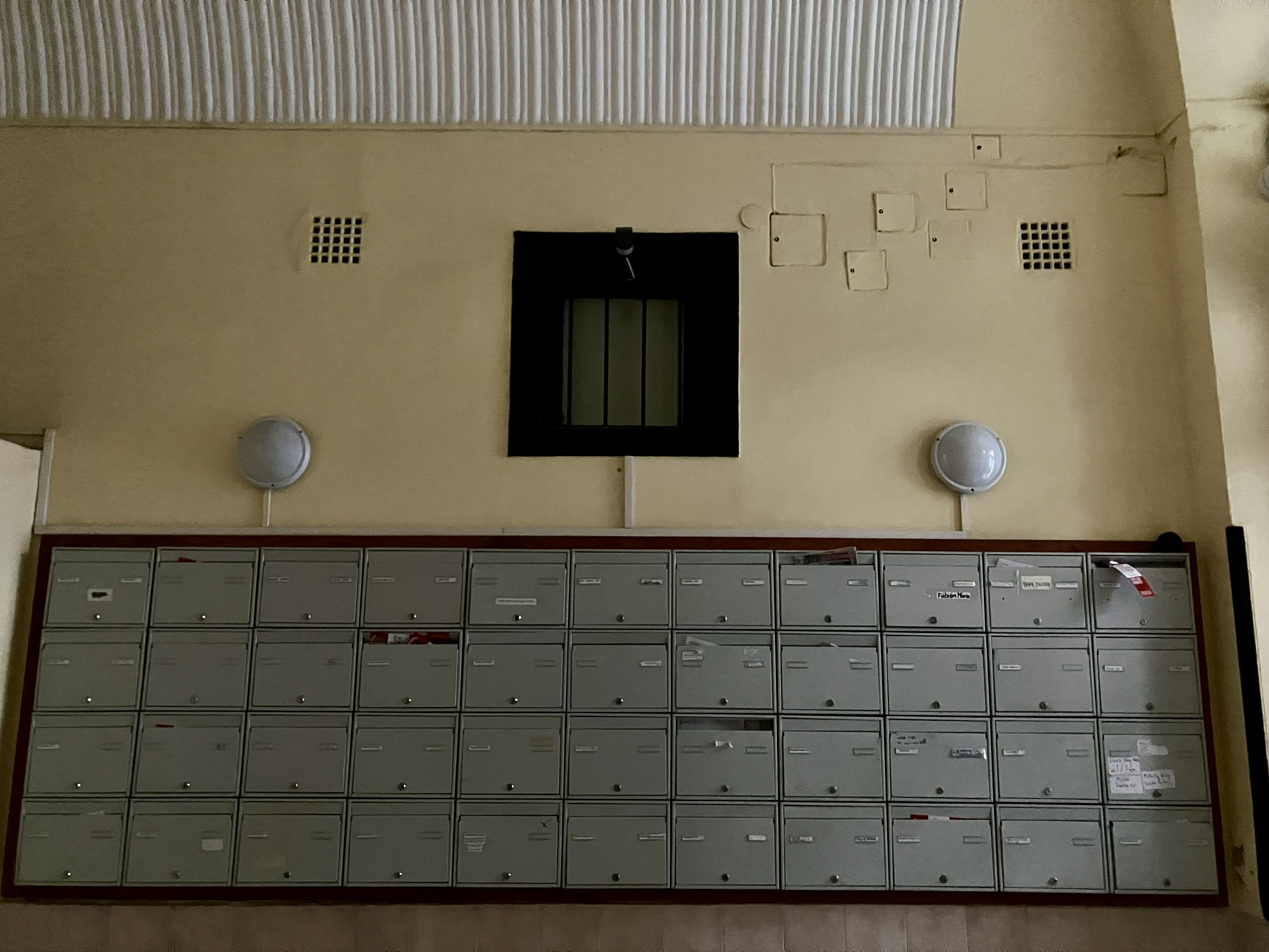 A kapun belépve a falon fantáziadús buherálás és idejétmúlt formatervezetlenségű elektromos dobozok, ajtónyitó kapcsolók foglalják