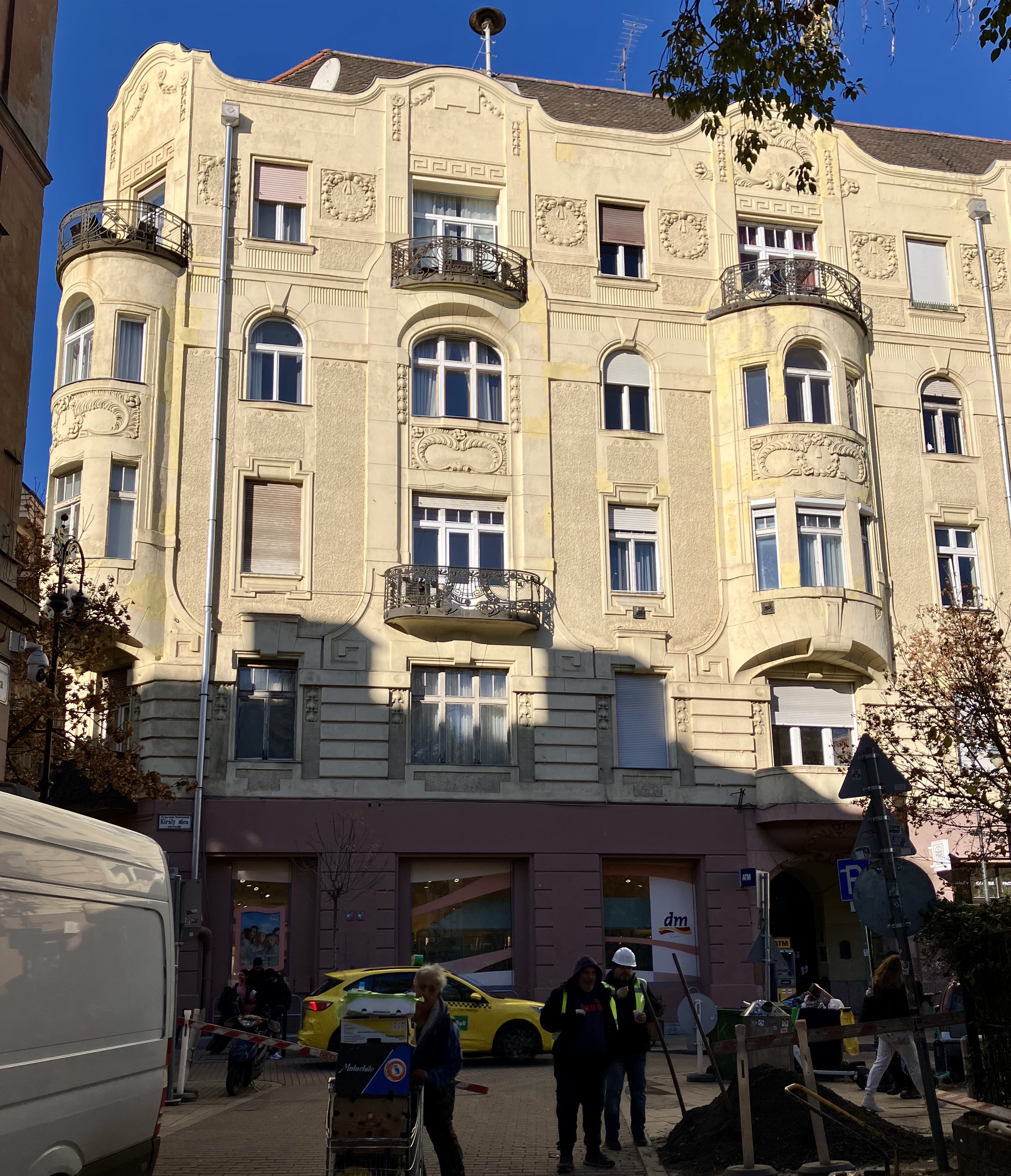 Amikor a Király utcát felújították, akkor már itt laktunk. Hát mikor is? Tízes években? (2010) Nem tudom, de pont itt laktunk. Borzalmas volt, halálra röhögtük magunkat, amikor… Elvitték a macskaköveket! Helyette ezeket hozták, ezeket a gránitlapokat, és hú, és fűrészelték és csodálkoztak, hogy nem ott törik, ahol kellene. Na mindegy, szépen meg volt tervezve. Olcsó emberekkel, vagy én nem tudom, nem-hozzáértőkkel sikerült megoldani a kivitelezést. Nem tudom, emlékszik-e, hogy minden egyes lámpaoszlop valamilyen másik szögben dőlt egy darabig. Szóval ilyen apróságok azért voltak. Pedig sok pénz volt benne, meg sok ötlet. Azt hiszem, a Király utca ezzel, hogy felújult egészen kicserélődött.