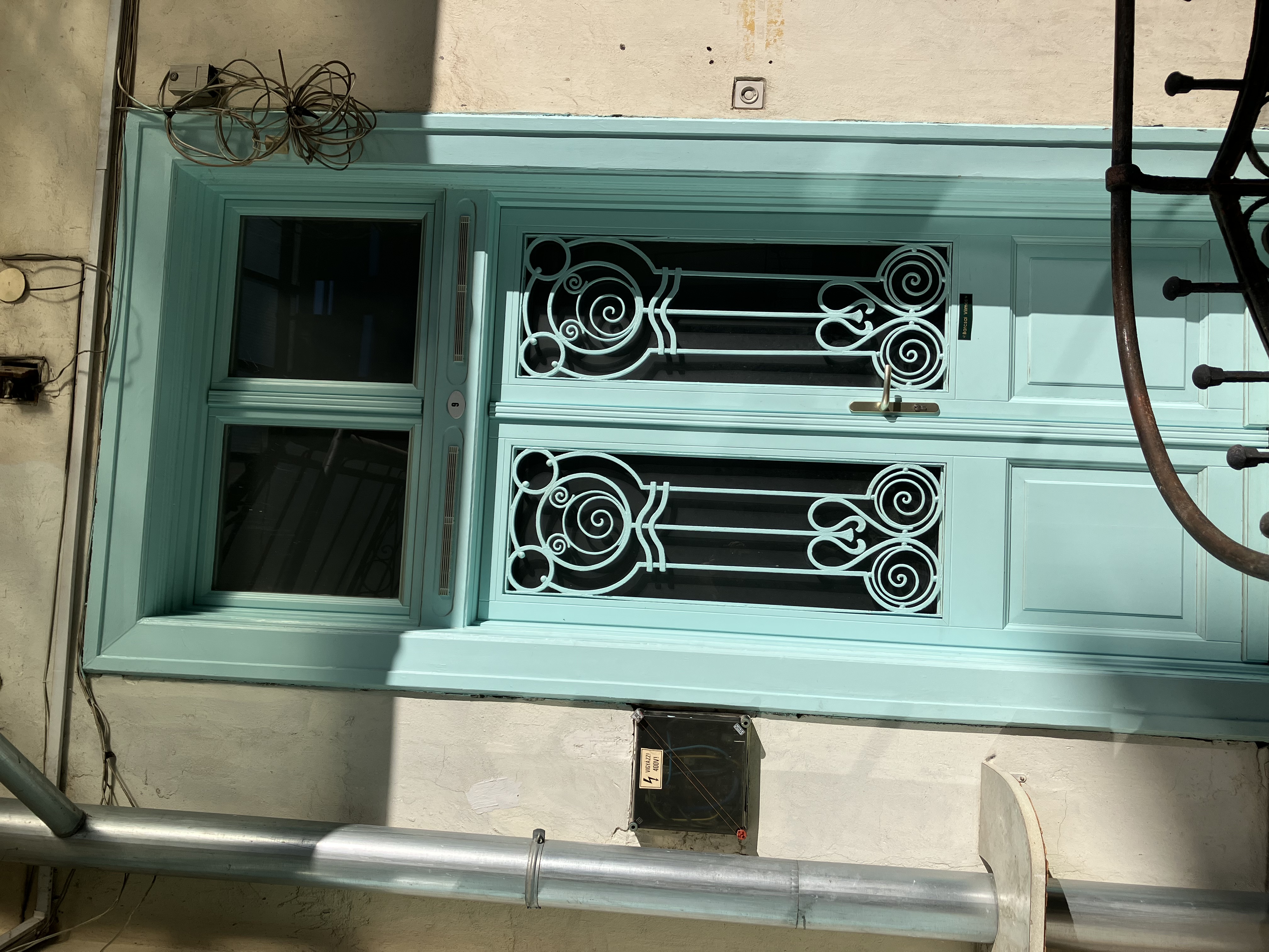 Több helyen szabadon lengő kábelek, vagy a homlokzathoz habarccsal ragasztott vezetékek az építő és gépészeti ipar utóbbi 30 évének szégyene, egész Budapesten. Ez a ház sem kivétel. A kapuban álló bankautomata randasága túltesz még kétes üzleti értékén is, dehát fizetik a háznak a bérleti díjat érthető, hogy nehéz lemondani róla.