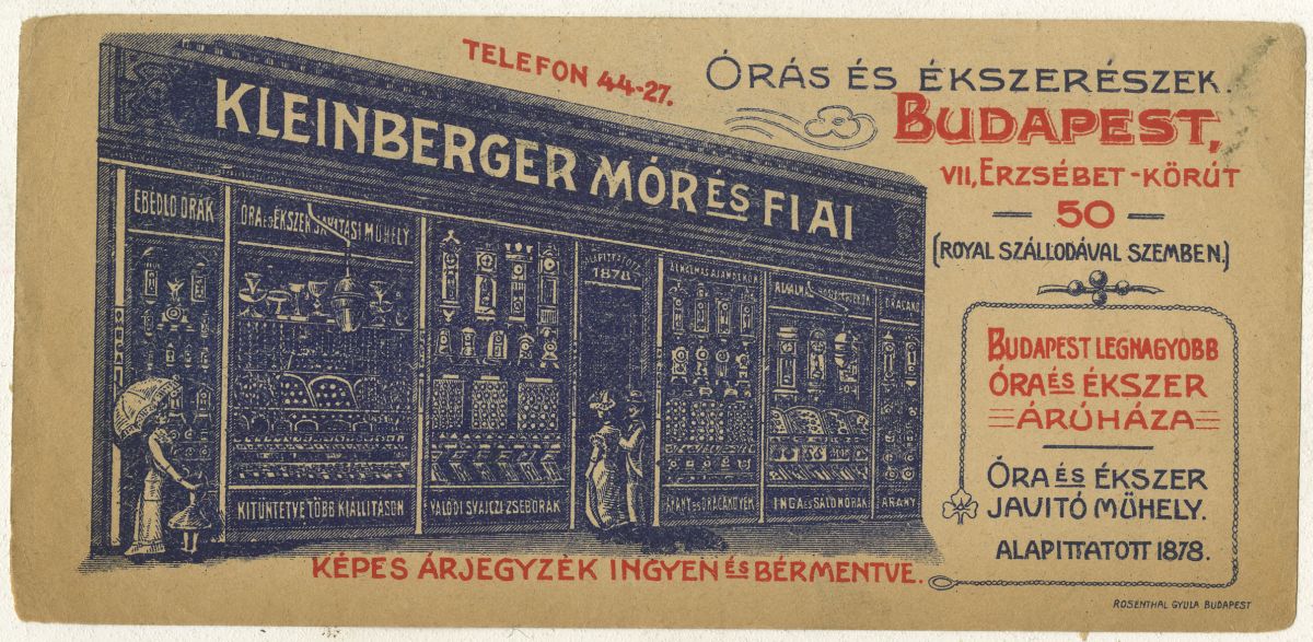 Kleinberger Mór és Fiai órás és ékszerészek. Budapest, VII., Erzsébet körút 50. (Royal szállodával szemben)