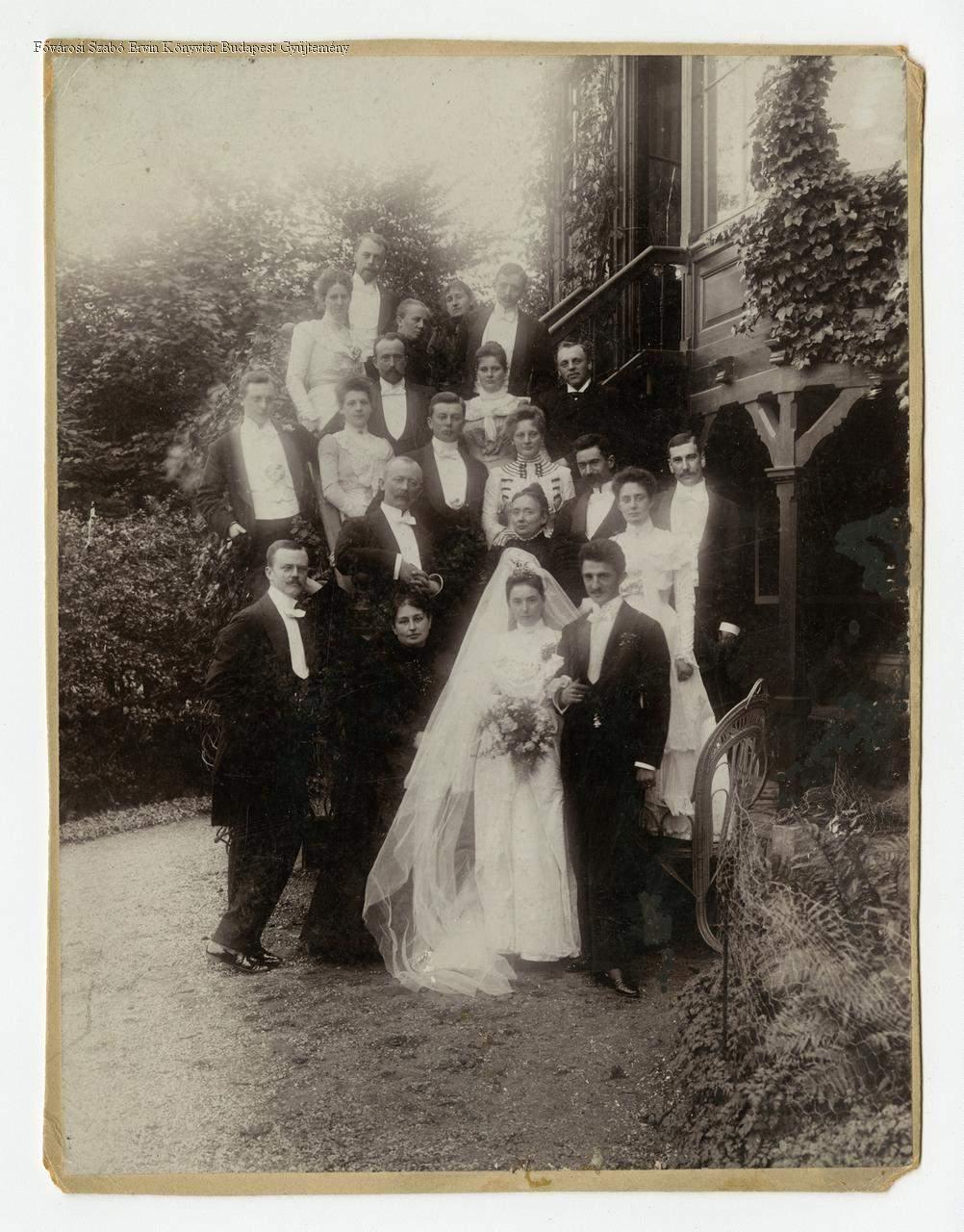esküvő, ünneplőruha, alkalmi ruházat, ünnepség, esküvői fénykép, csoportkép, kert, 1900
