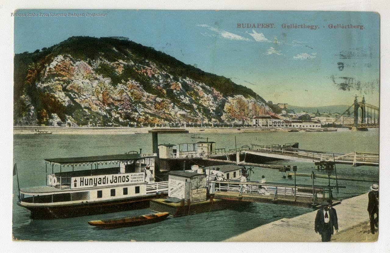 hegy, híd, hajóállomás, hajó, reklám, ember, képes levelezőlap, külső felvétel, látkép, 1900-as évek, 1910-es évek
