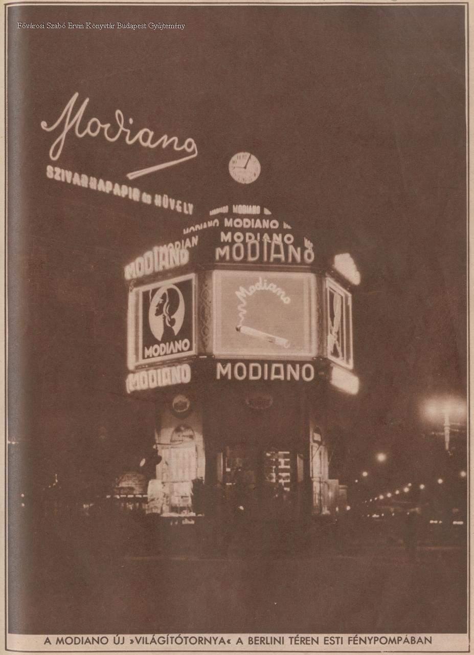 külső felvétel, reklám, fényreklám, neon, hirdetés, pavilon, cigarettapapír, dohányzás, köztéri óra, este, éjszaka, 1930