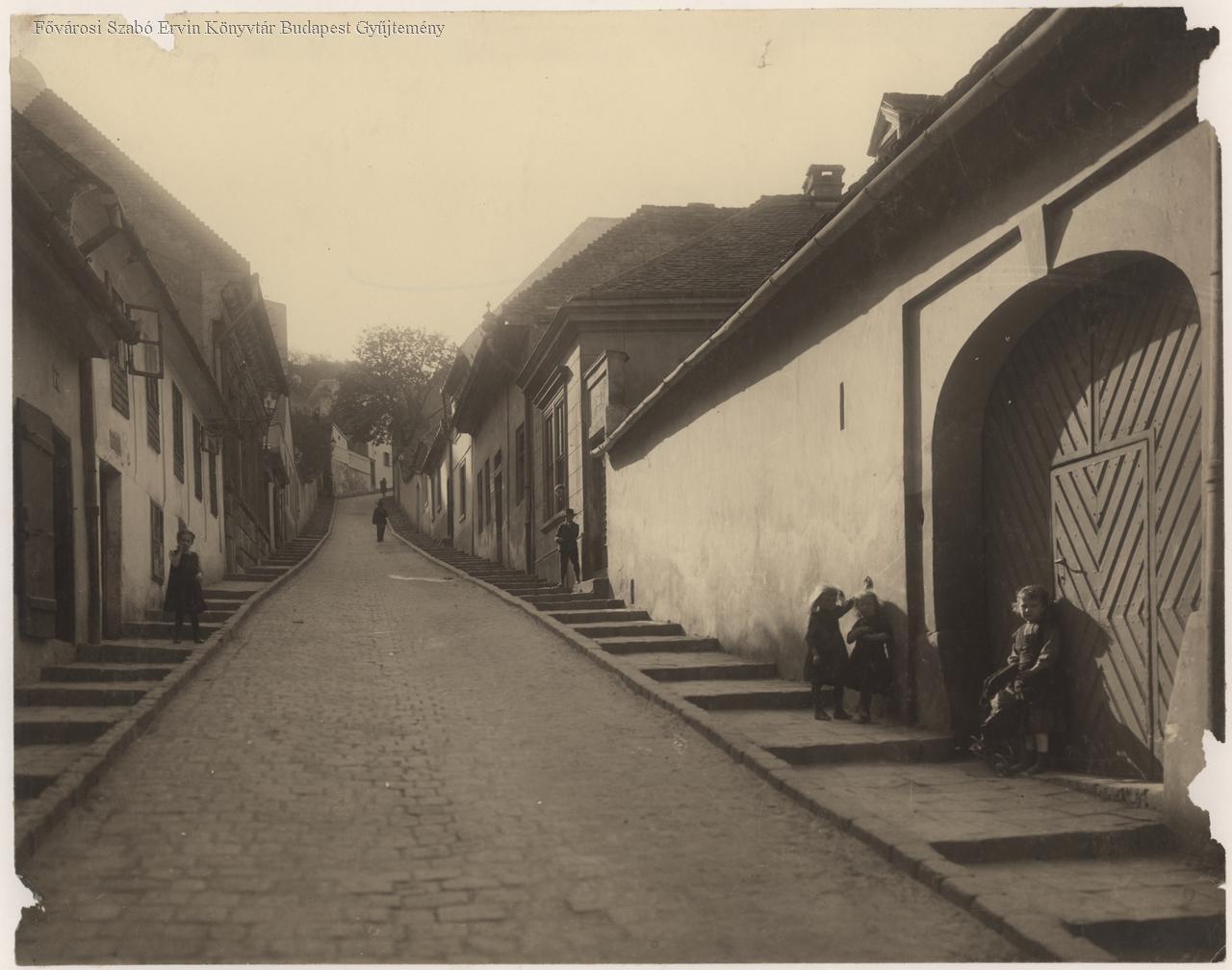 Meredek utca. Kövezett út, a járda helyén lépcsősor. Az utcán játszó kislányok. Játék babakocsi