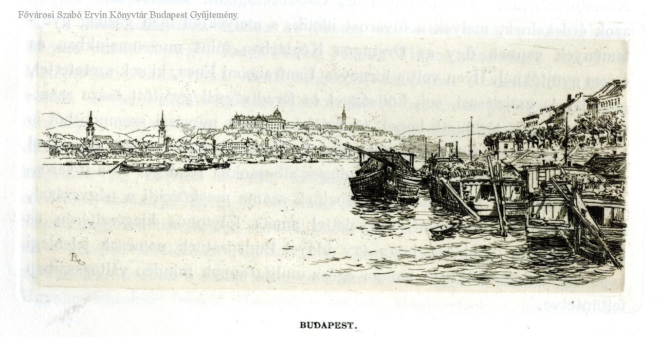 Buda látképe a pesti Duna-partról. Előtérben hajók a kikötőben