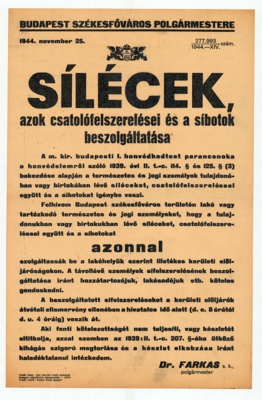 A Budapesten tartózkodó természetes és jogi személyek sífelszereléseinek beszolgáltatásáról szóló felhívás.