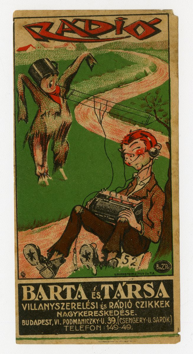 rádiózás, rádióhallgatás, rádiókészülék, fejhallgató, elektromosság, villanyszerelés, alkatrész, fiú, madárijesztő, humor, reklámnyomtatvány, kisnyomtatvány, aprónyomtatvány, számolócédula