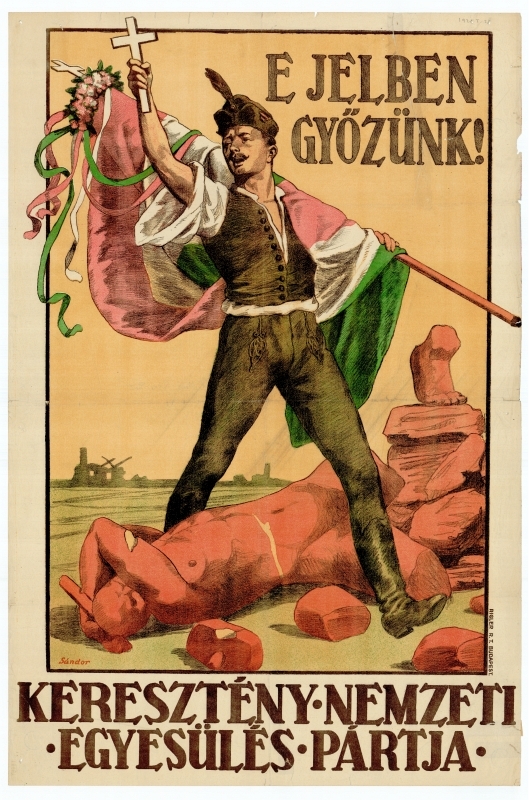 1920-as Keresztény Nemzeti Egység Pártja, antibolsevista választási plakát. Egy fiatal férfi látható rajta egy ledöntött szobor előtt állva, kezében zászlóval és kereszttel, a következő felirattal: E jelben győzünk!