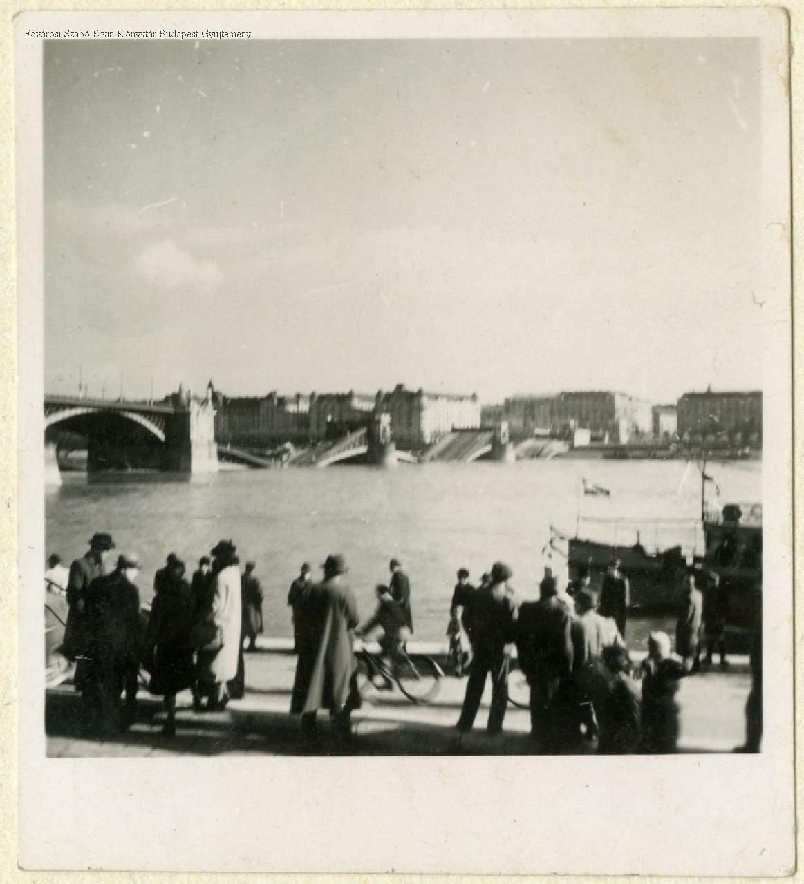 [A II. világháborúban a németek által aláaknázott Margit híd korábban már felrobbant pesti szárnya, 1945. január 18.]
