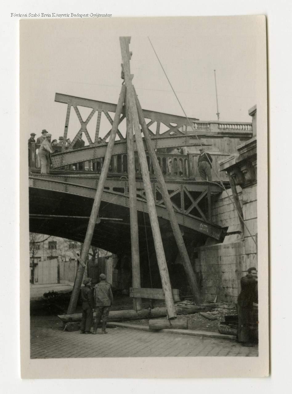 A híd felállványozott pesti hídfőjén végzett munkálatok, hídelem emelése