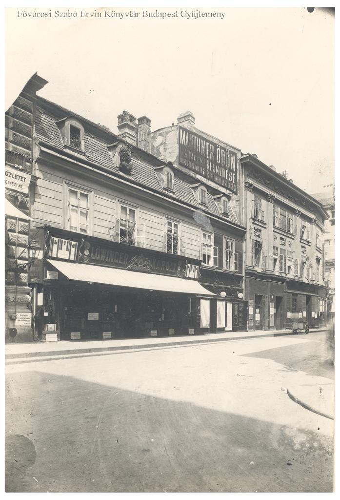 Mauthner Ödön magkereskedését hirdető tábla a tűzfalon, az első házban Löwinger Károly üzlete. A ház bontását hirül adó feliratok