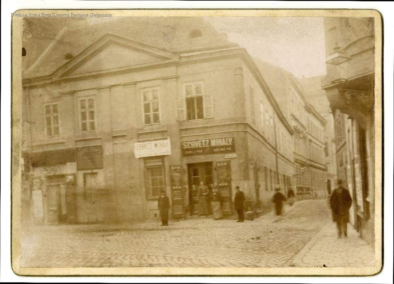 [Schwetz Mihály bor- és sörkímérése (volt Csiga vendéglő) az egykori Sebestyén tér és Irányi utca sarkán, 1897. február 23.]