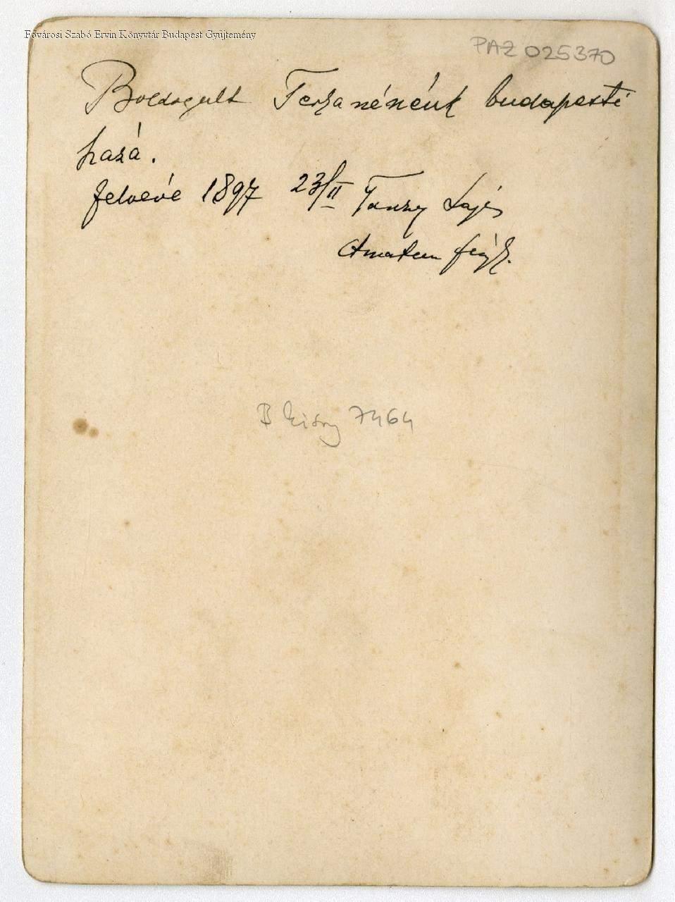 Kézzel írt felirat a hátoldalon: "Boldogult Terka nénénk budapesti háza. Felvéve 1897.02.23. Tankey (?) Lajos, Ancartem (?) fényk." A házon valószínűleg a bontás miatt költözést hírül adó felirat