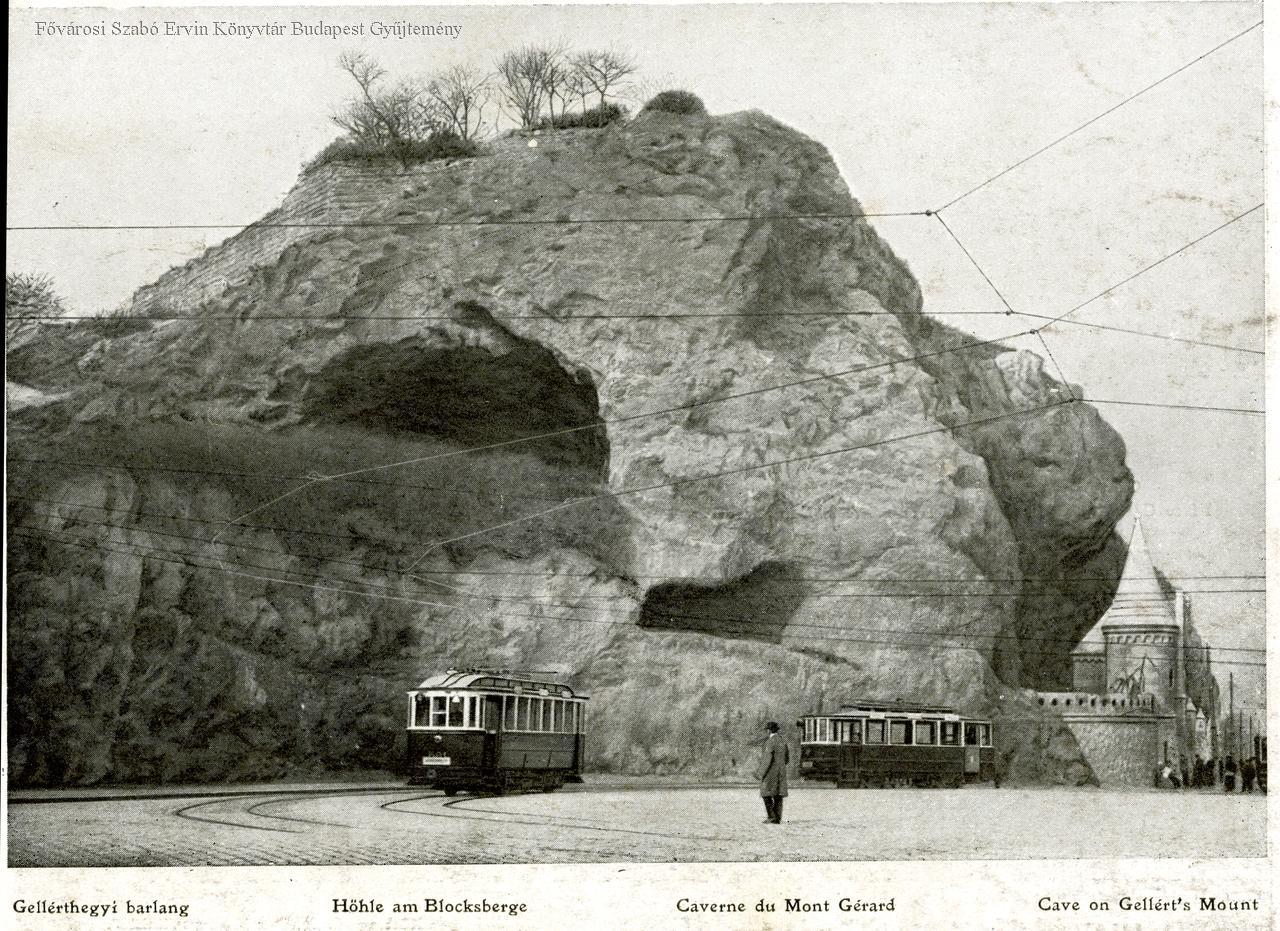 A Gellérthegy a Gellért tér elől. A barlang bejárata. Előtérben villamosok