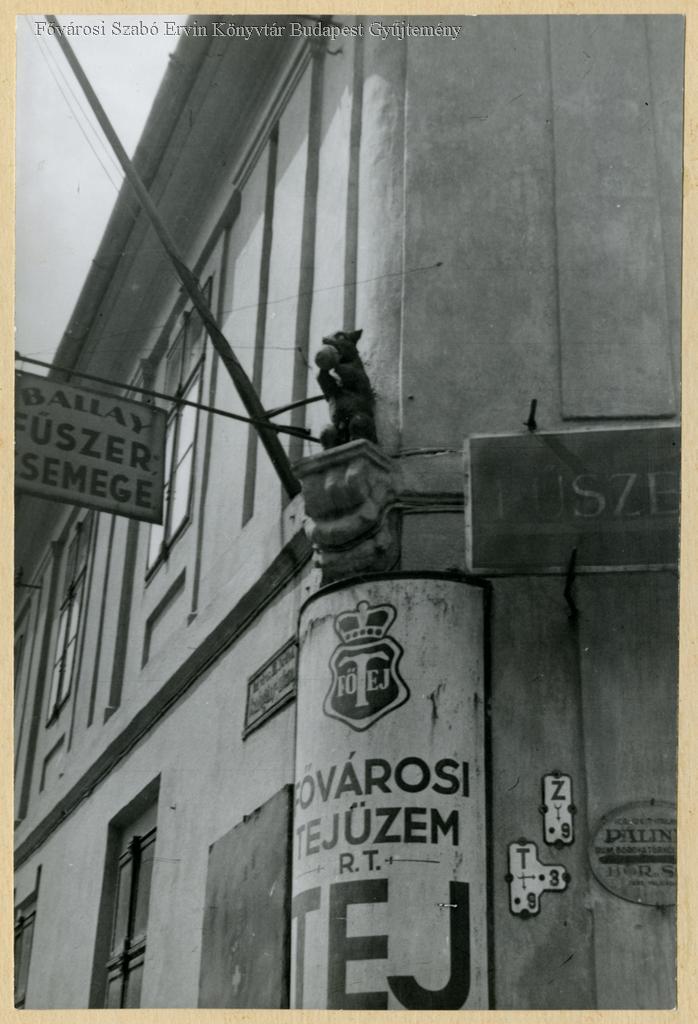 Sarokházon az első emelet magasságban kis medve kőszobor. Más felvétel erről: Tolnai Világlapja 1942. No 36. p. 22.