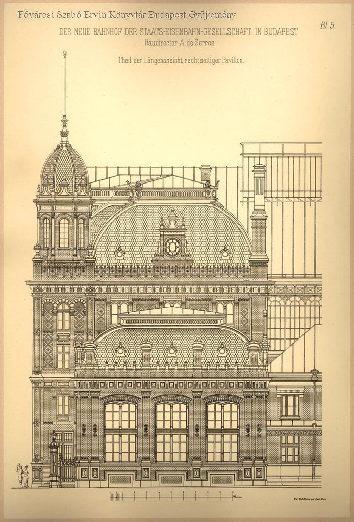 Der neue Bahnhof der Staats-eisenbahn Gesellschaft in Budapest: Baudirector A. de Serres Theil der Längenansicht rechtseitiger Pavillon /