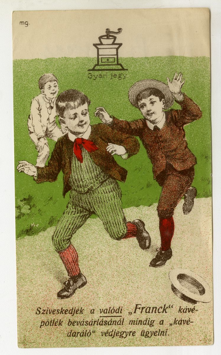 pótkávé, kávé, cikória, ital, gyermek, fiú, kalap, fogócska, játék, kávédaráló, védjegy, reklámnyomtatvány, kisnyomtatvány, aprónyomtatvány, számolócédula