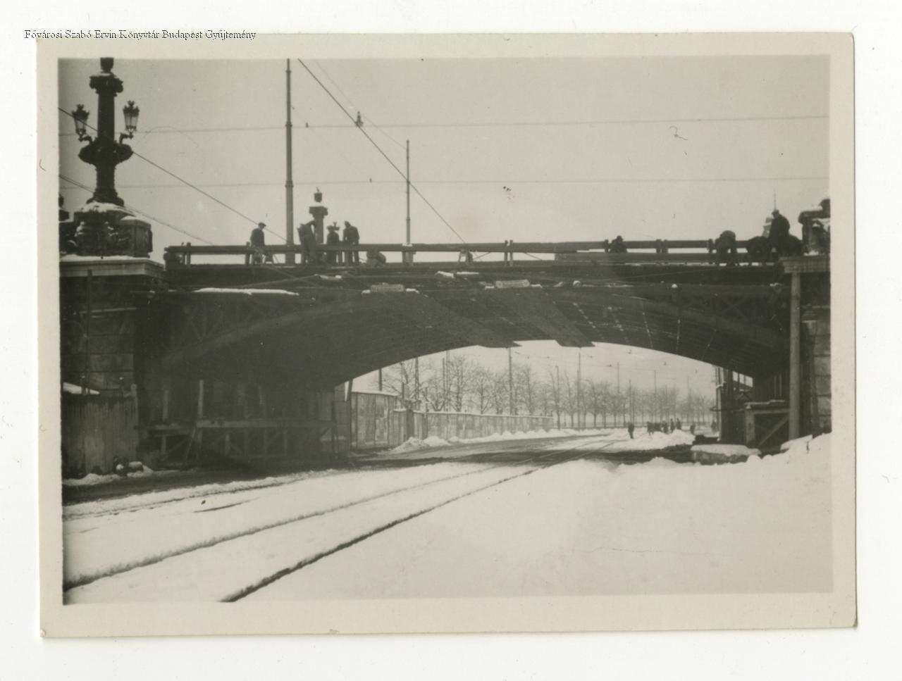közúti híd, hídépítés, munkás, munkavégzés, tél, villamosközlekedés, vasúti pálya, külső felvétel, látkép, 1930-as évek