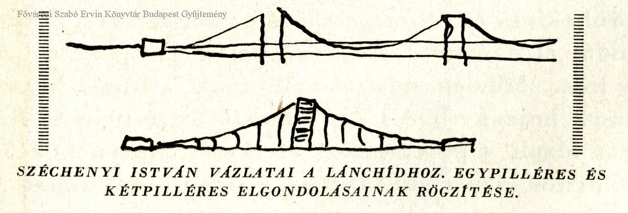 Széchenyi István vázlatai a Lánchídhoz, egypilléres és kétpilléres elgondolásainak rögzítése