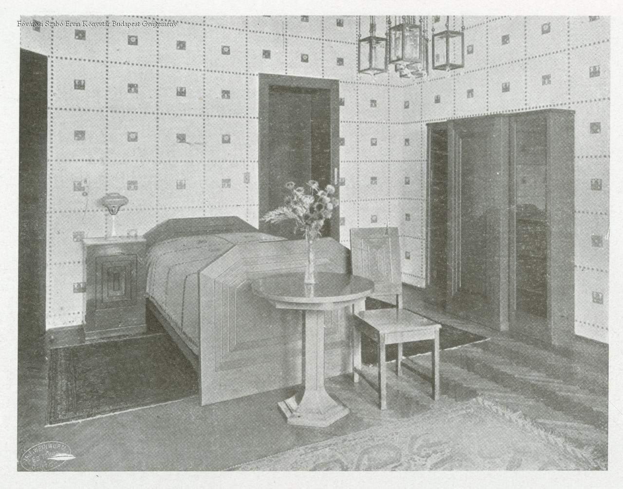 belső felvétel, családi ház, villa, hálószoba, bútor, ágy, szekrény, fotel, asztal, ablak, üvegfestmény, épületdísz, falburkolat, dolgozószoba, 1912