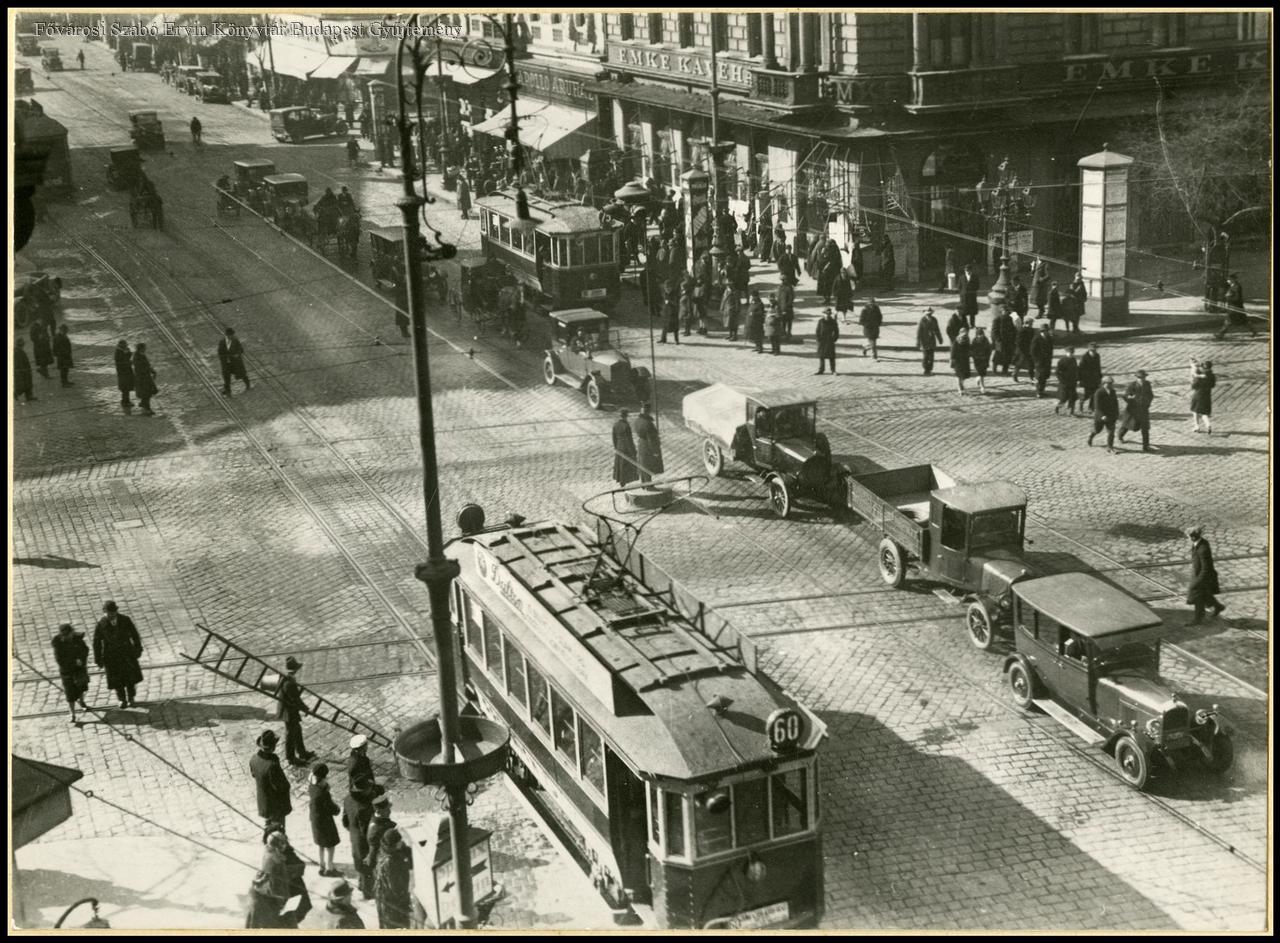 Képen az EMKE Kávéház, az Apolló áruház és a New York áruház táblája látható, továbbá a 60-as és a 75-ös villamosok és teherautók