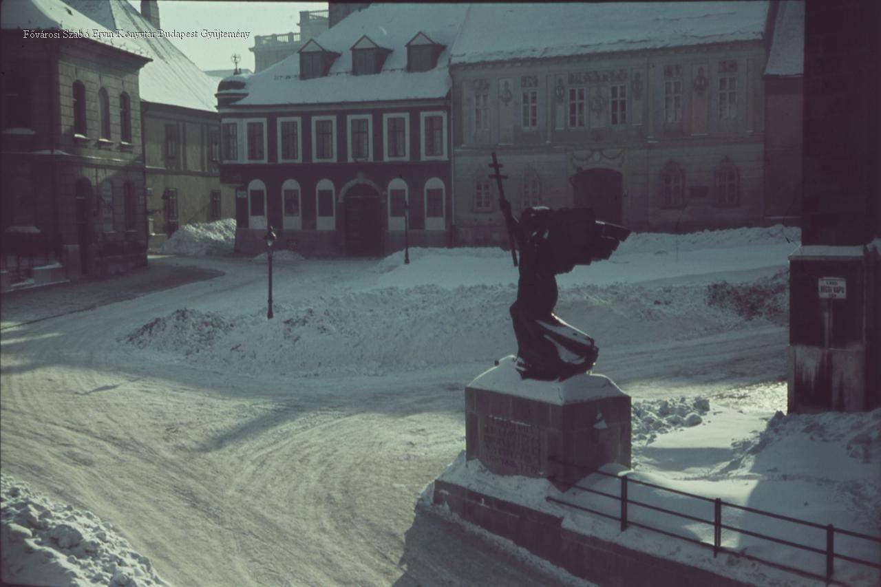 utcakép, tér, szobor, emlékmű, angyal, lakóépület, tél, hó, lámpaoszlop, 1937-1944