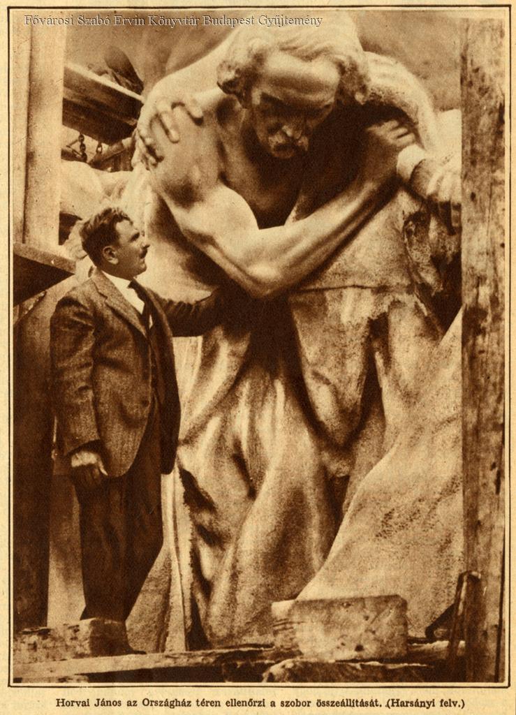 A készülő Kossuth-szobor egyik mellékalakja előtt áll a művész. Horvay János többalakos Kossuth-szobrát 1927-ben állították fel a Kossuth téren. 1952-ben lebontották, előbb a Mező Imre úti temetőbe, majd Dombóvárra szállították