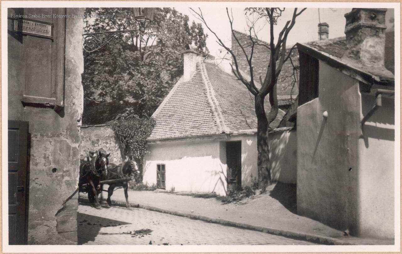 külső felvétel, lakóépület, lovas kocsi, útburkolat, ló, fa, utcakép, 1930-as évek