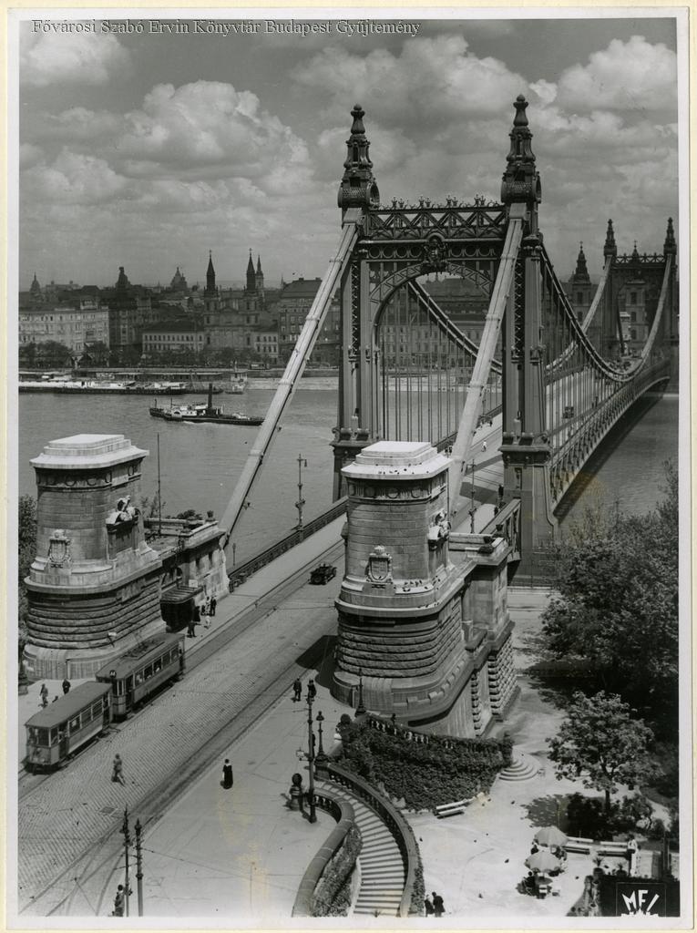 közúti híd, látkép, villamos kocsi, lépcső, park, vízi jármű, hídfő, 1942