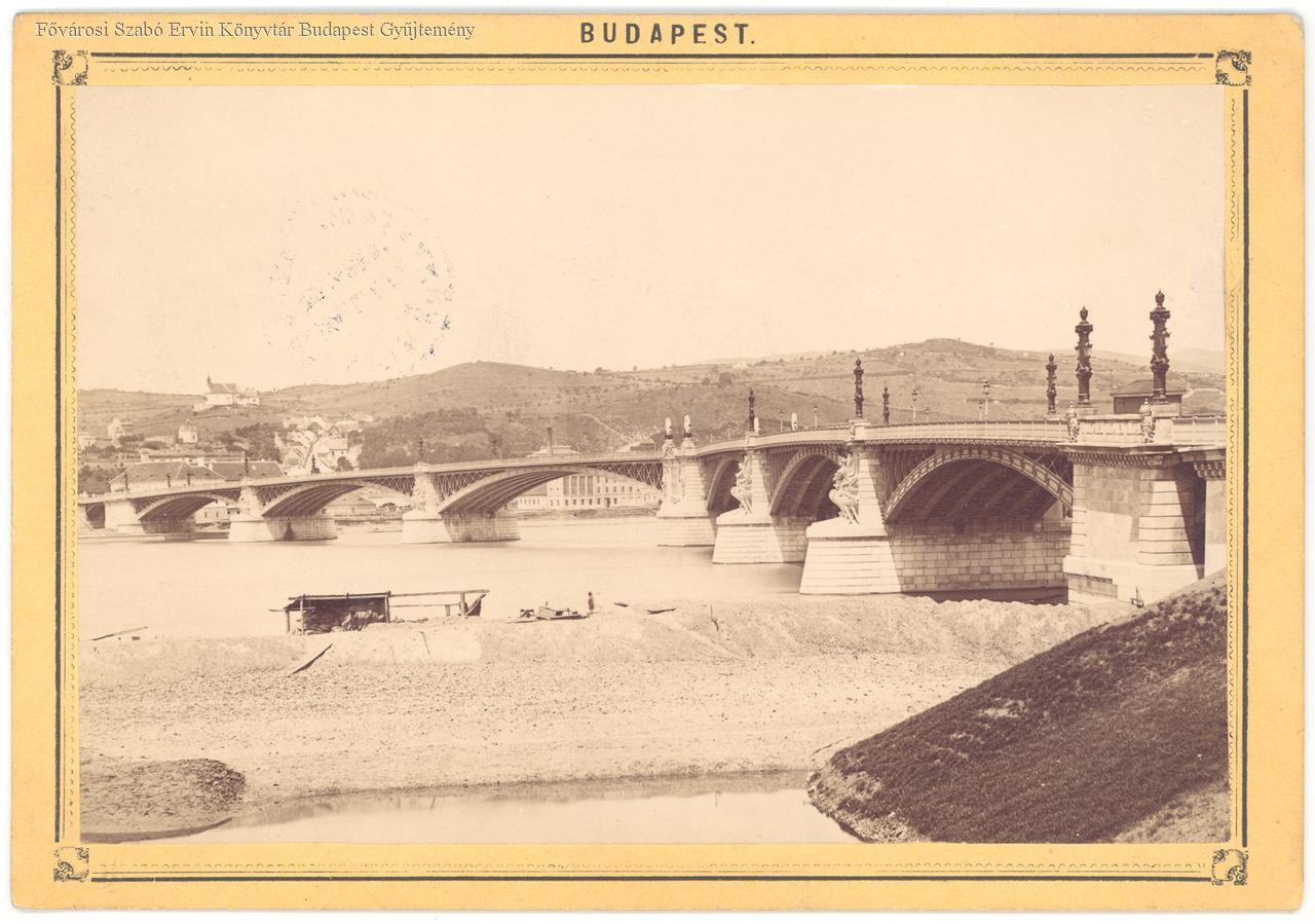 [Margit-híd pesti dunaparti töltése, háttérben rózsadombi látkép]