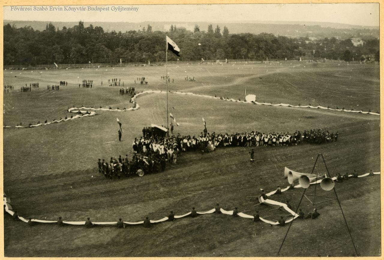 [A gödöllői jamboree, 1933. július 22. és augusztus 15. között] [lengyel cserkészek zászlókkal rakják ki a réten hazájuk térképét és felsorakoznak]
