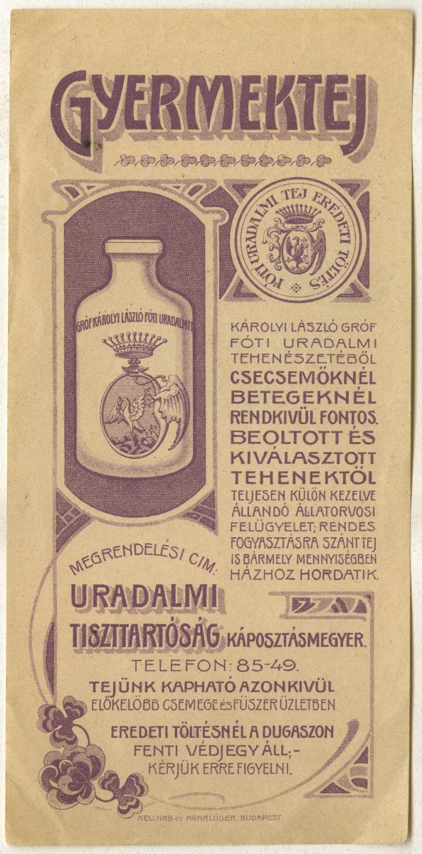 Károlyi László gróf fóti uradalmi tehenészetéből csecsemőknél betegeknél rendkívül fontos. Beoltott és kiválasztott tehenektől. Teljesen külön kezelve. Állandó állatorvosi felügyelet. Rendes fogyasztásra szánt tej is bármely mennyiségben házhoz hordatik. Megrendelési cím: Uradalmi Tiszttartóság Káposztásmegyer. Telefon 85-49. Tejünk kapható azonkívül előkelőbb csemege és fűszerüzletben. Eredeti töltésnél a dugaszon fenti védjegy áll. Kérjük erre figyelni.