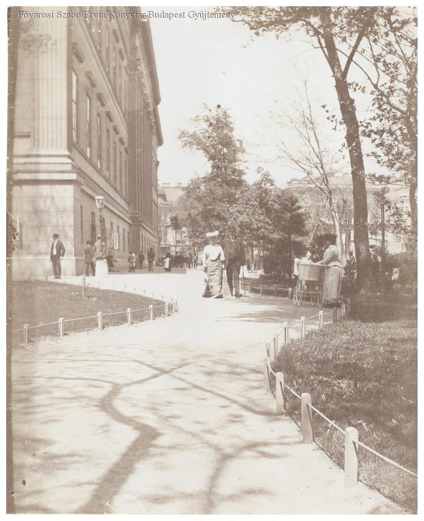 múzeum, park, kert, sétány, szabadidő, férfi, nő, babakocsi, ruházat, életkép, 1910