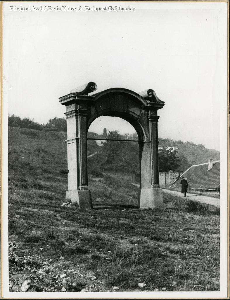 A felvétel ideje 1933. október. Az egykori temető egy kapuzata, háttérben a Szent Vér kápolna