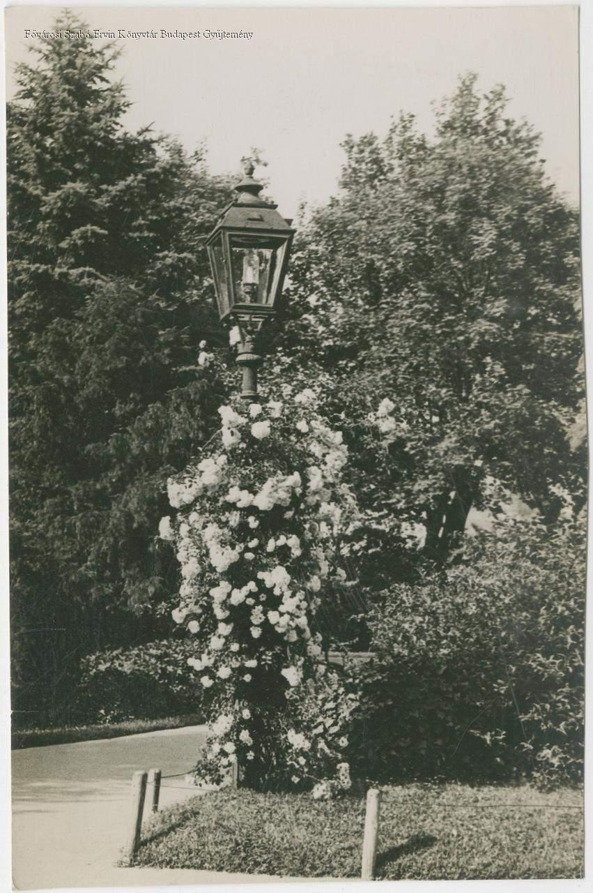 [Parkrészlet az Erzsébet híd budai hídfőjénél, lámpaoszlopra felfuttatott virágbokor]