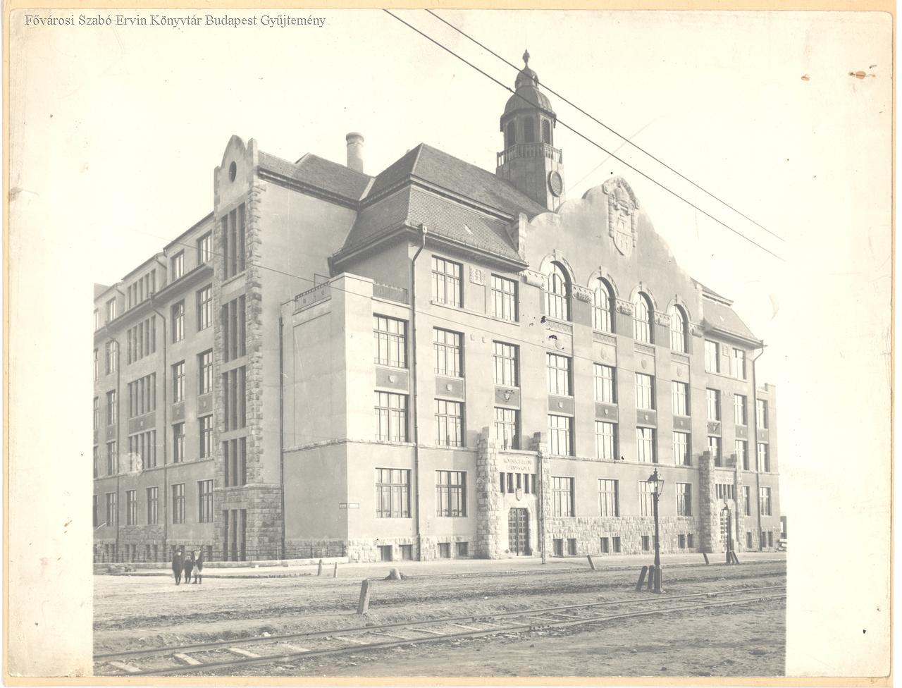 általános iskola, polgári iskola, iskolaépület, címer, torony, lámpa, közvilágítás, villamos közlekedés, vasúti sín, épületkép, 1913 körül